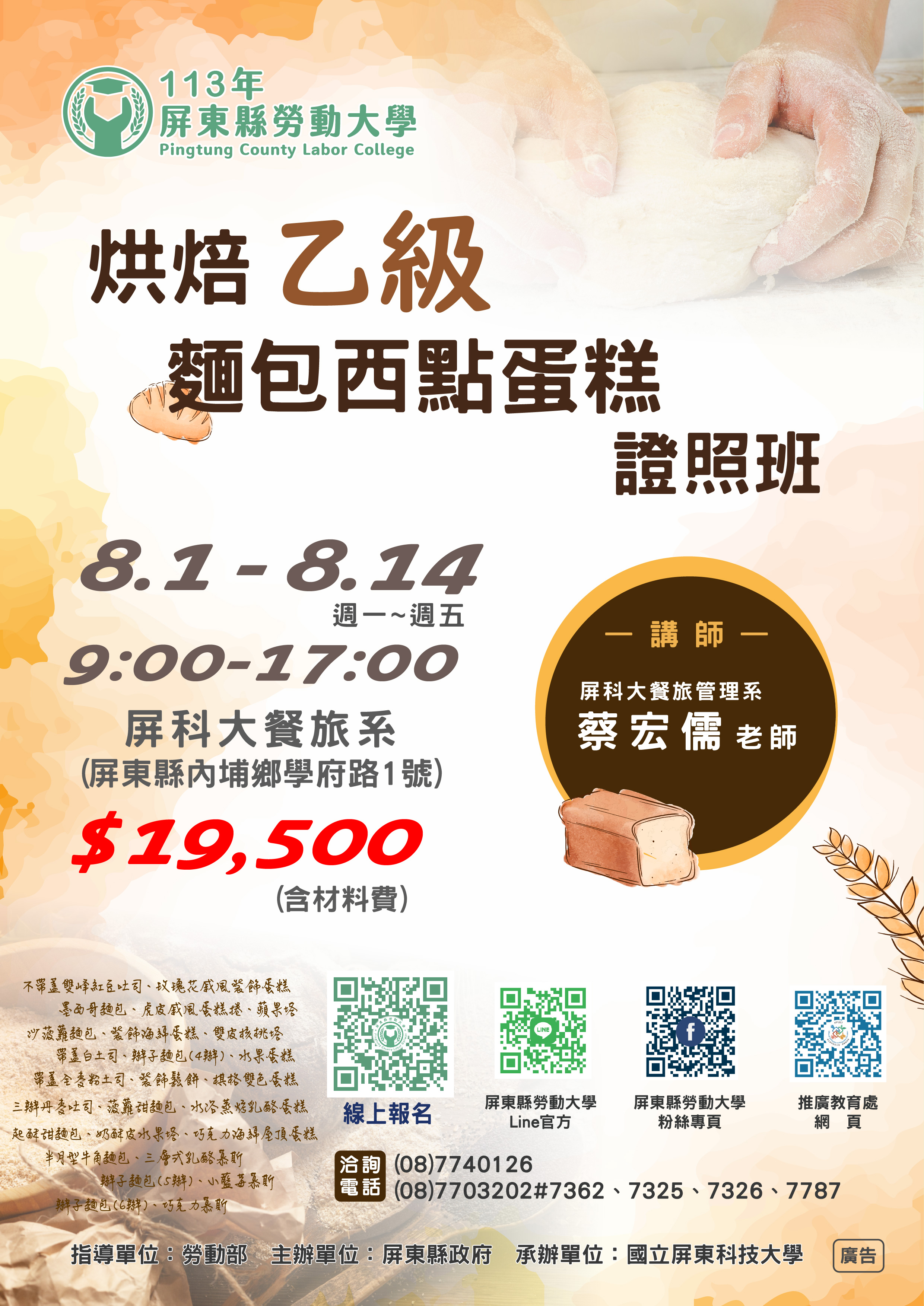 【📢課程招生 | 烘焙乙級麵包西點蛋糕證照班🍰】 #烘焙乙級 #證照班 #烘焙課程 -------------------------------------------- 烘焙西點蛋糕、麵包乙級證照為烘焙類最高技術證照 本課程依照乙級證照10道題組排課🍞 藉由參加課程精進自我技能為職能加分💪 -------------------------------------------- ℹ️報名資訊⬇️ 🗓時間:8/1-8/14 星期一至星期五9:00-17:00 📍地點:屏科大(屏東縣內埔鄉學府路1號) 💰學費:19,500元(含材料費) 👤授課對象:年滿18歲,設籍、工作或就學於屏東縣一般民眾 ☎️洽詢電話:(08)7740126、(08)7703202#7326 🔗報名網址:https://reurl.cc/NQGVxk