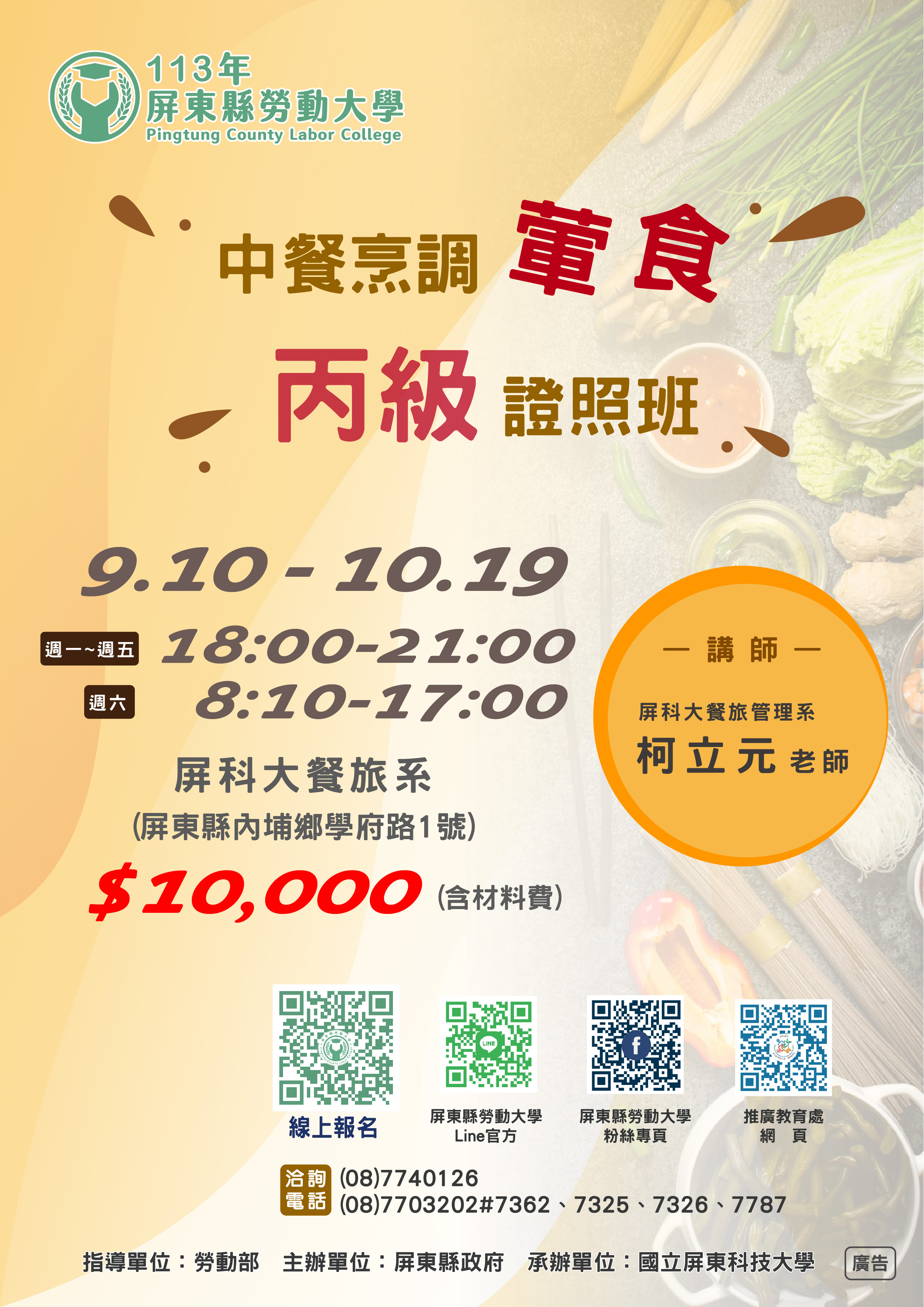 【📢課程招生 | 中餐烹調(葷食)丙級證照班】 -------------------------------------------- 餐飲丙級證照為投身餐飲業或是自行創業開設餐館、小吃店等最基礎之證照 無論是二度就業或興趣培養 皆可藉由參加課程增進自我實力 提升就業選擇與職能 -------------------------------------------- ℹ️報名資訊⬇️ 🗓時間:9/10-10/19 星期一至星期五18:00-21:00、星期六8:10-17:00 📍地點:屏科大(屏東縣內埔鄉學府路1號) 💰學費:10,000元(含材料費) 👤授課對象:年滿18歲,設籍、工作或就學於屏東縣一般民眾 ☎️洽詢電話:(08)7740126、(08)7703202#7326 🔗報名網址:https://reurl.cc/NQGVxk