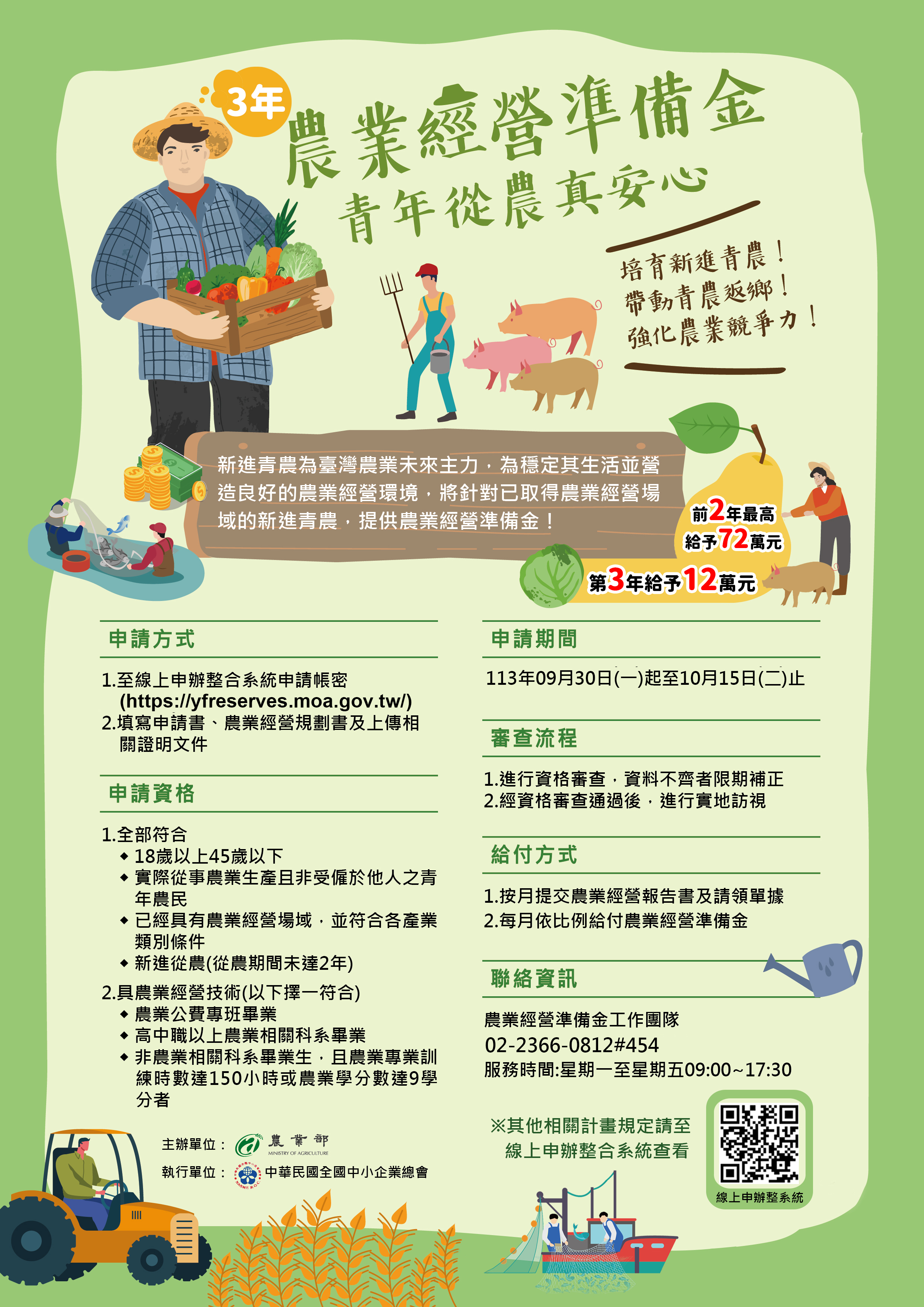 說明: 一、農業經營準備金係針對年齡18歲至45歲的新進農民,若其具有農業經營技術及農業經營場域者,前2年最高給予36或72萬元,第3年最高給予12萬元;本案申請期間為113年9月30日起至10月15日止,皆採線上報名進行,相關申請可至本部農業經營準備金線上申辦整合系統(https://yfreserves.moa.gov.tw/yf/index.php)辦理。