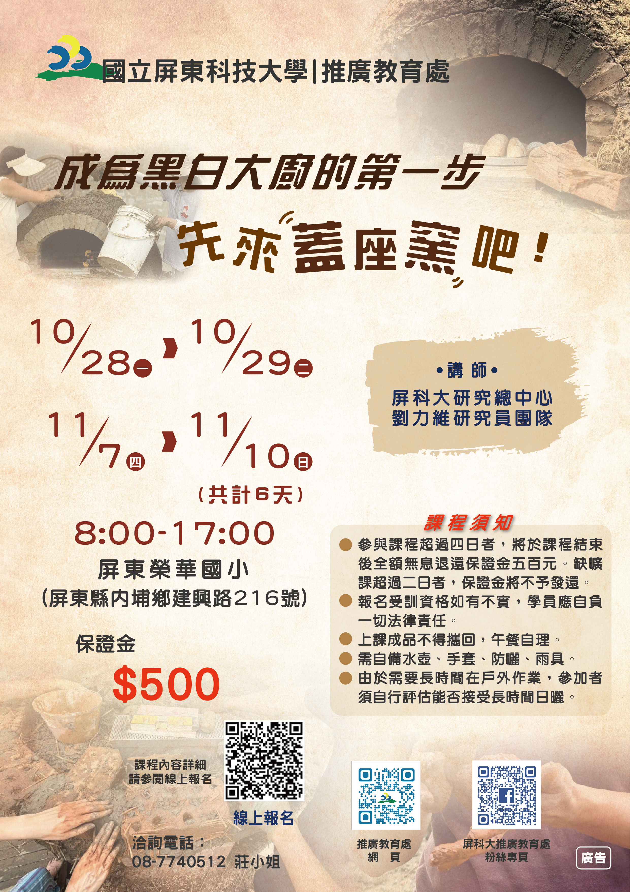 👍時間:10/28(一)-10/29(二)、11/7(四)-11/10(日)共計六天,每天👍上課時間08:00-17:00 👍地點:屏東榮華國小(屏東縣內埔鄉建興路216號) 👍對象:想親手製作土窯或是對於土窯興建有興趣者。 👍費用:保證金500元 👍人數:5 👍課程須知: 1.參訓學員出勤達到四日者,將於課程結束後將保證金500元全額無息退還。(若缺曠課超過二日將沒入保證金)。 2.報名受訓資格如有不實,學員應自負一切法律責任。 3.上課成品不得攜回,午餐自理 4.需自備水壺、手套、防曬、雨具 5.由於需要長時間在戶外作業,參加者須自行評估能否接受長時間日曬。 👍報名連結:https://forms.gle/436rRABM3M5qaqd76