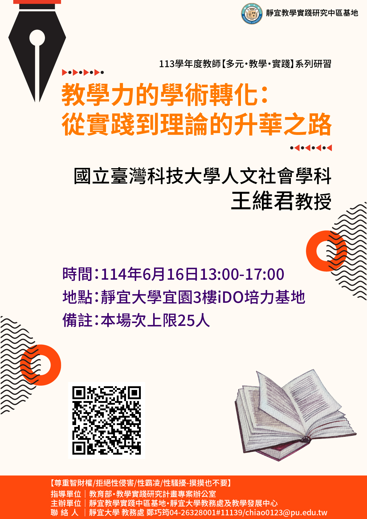 【教學實踐研究計畫】中區基地訂於114年6月16日辦理「教學力的學術轉化:從實踐到理論的升華之路」,敬邀本校教師踴躍報名參加。