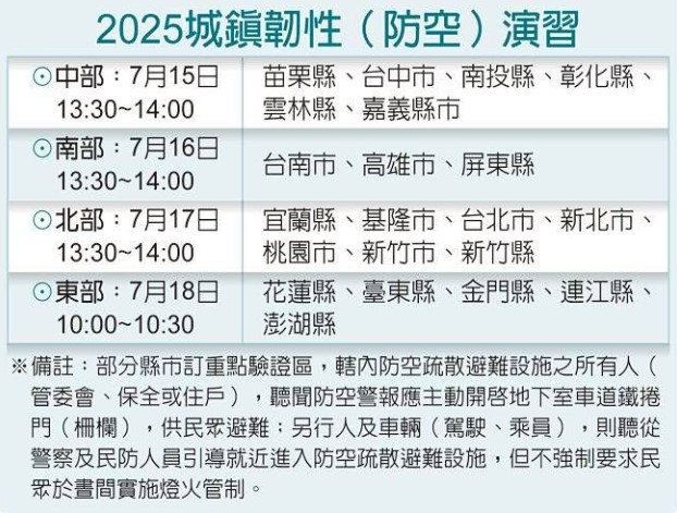 一、演習時間如下: (一)中部地區(苗栗縣、臺中市、南投縣、彰化縣、雲林縣、嘉義市、嘉義縣):7月15日(星期二)13:30 時至14:00時。 (二)南部地區(臺南市、高雄市、屏東縣):7月16日(星期三)13:30時至14:00時。 (三)北部地區(宜蘭縣、基隆市、臺北市、新北市、桃園市、新竹市、新竹縣):7月17日(星期四)13:30 時至14:00時。 (四)東部地區(花蓮縣、臺東縣)、金門地區(金門縣)、馬祖地區(連江縣)、澎湖地區(澎湖縣):7月18日 (星期五)10:00時至10:30時。 二、演練項目:實施30分鐘警報傳遞與發放、疏散避難、交通及其他必要管制,包含全區實施人、車管 制,晝間演習不強制實施燈火管制。 三、請於演習當日注意相關警報發布時間,確實做好關門、關窗、關燈與避難等動作,並嚴禁於戶外地區活 動。 四、演習公告【多國語言文宣】版本如附件,請參考。