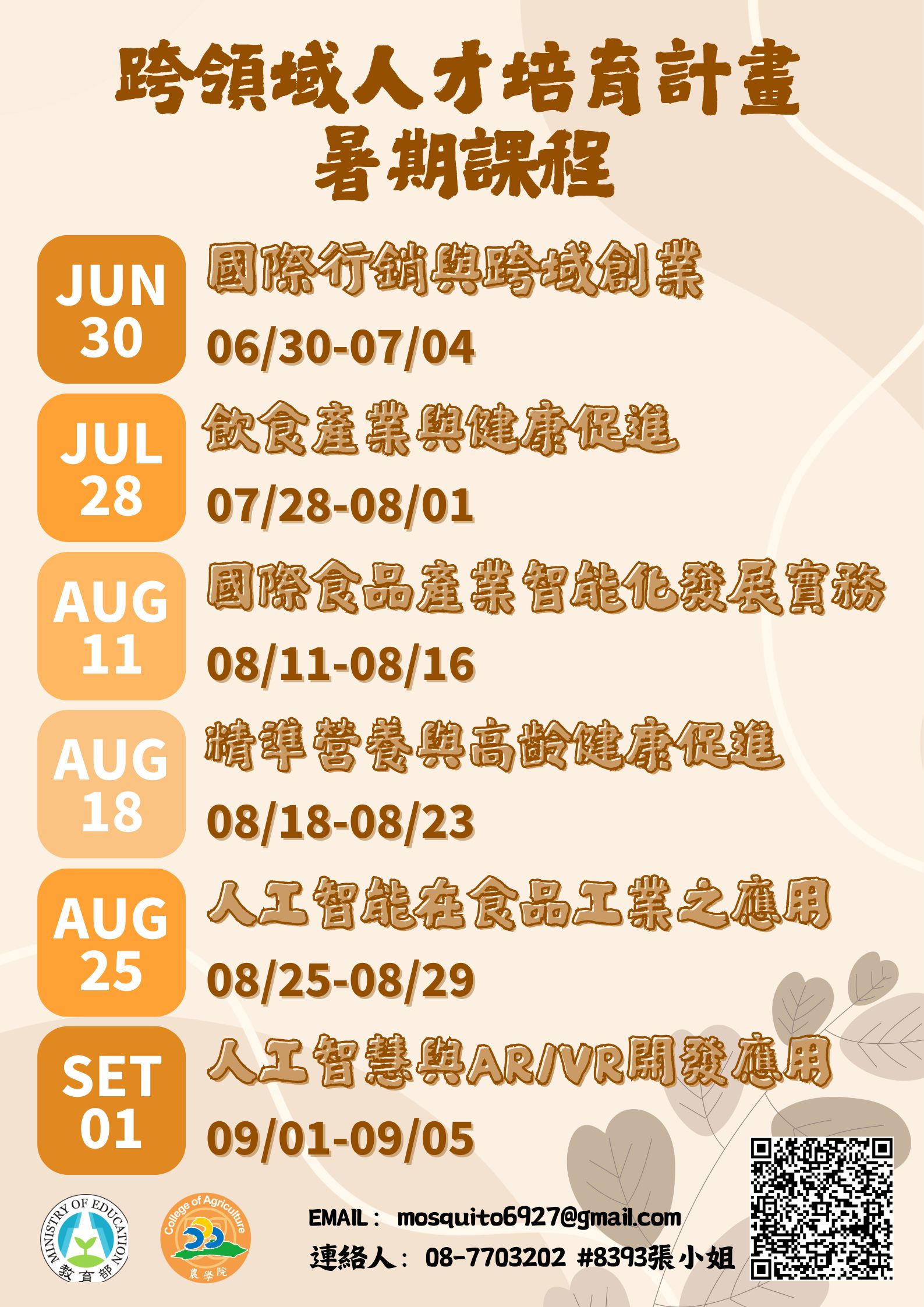 2.飲食產業與健康促進 日期:114年7月28日(一)至114年8月1日(五) 時間:09:00-12:00、13:00-18:00 地點:食品系館FS108,採實體授課 學分數:2
