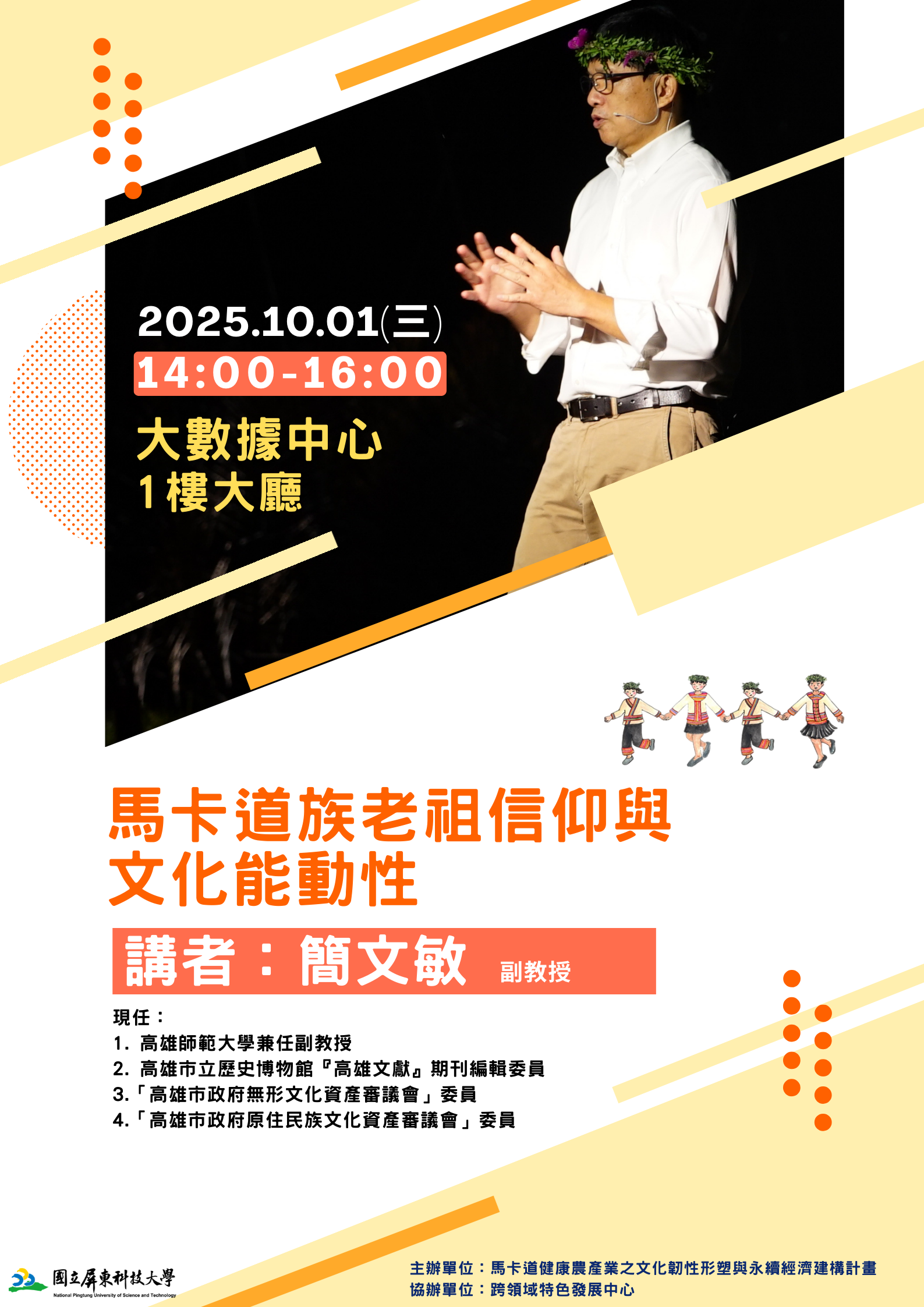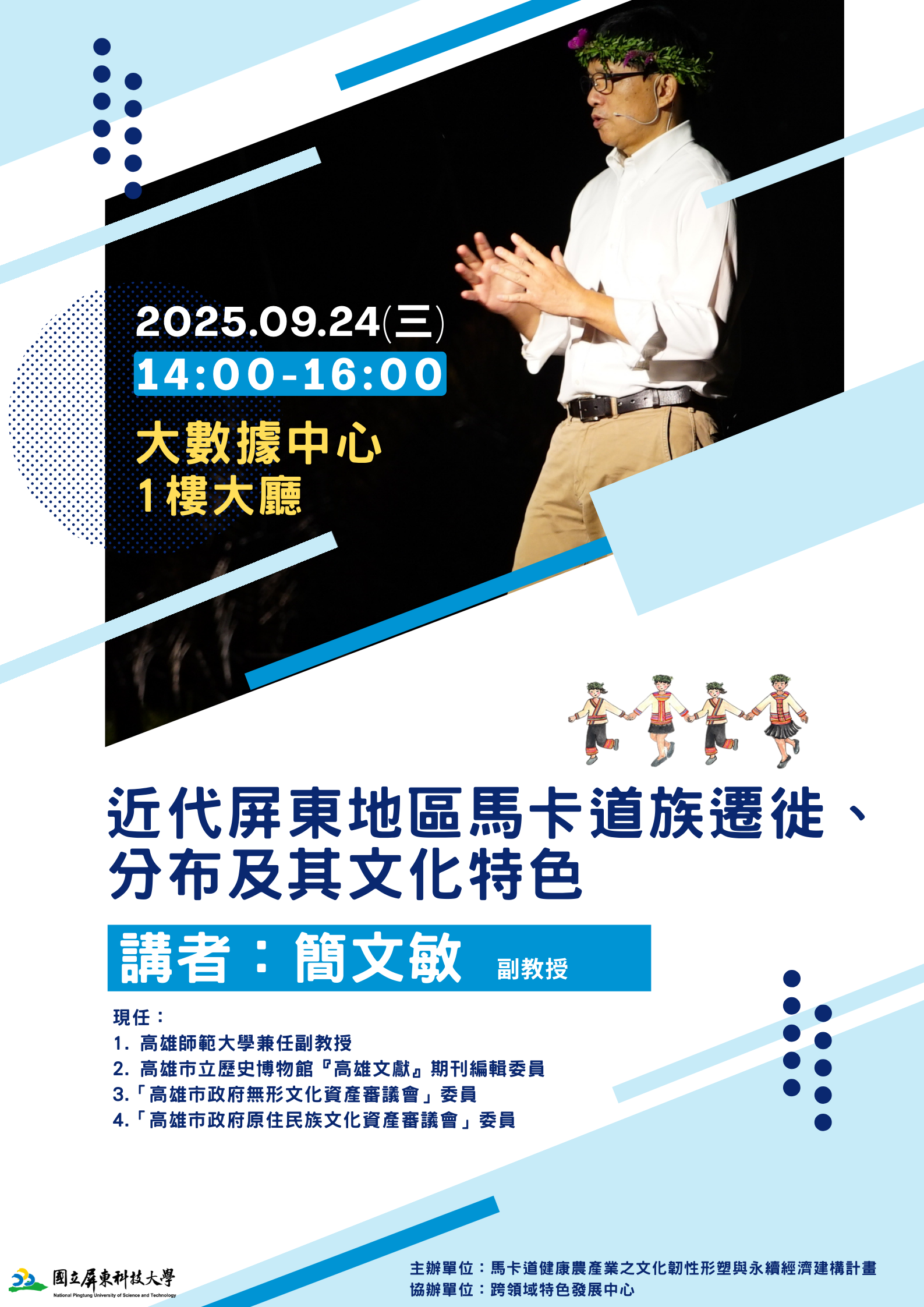 國立屏東科技大學馬卡道健康農產業之文化韌性形塑與永續經濟建構計畫邀請專家學者,帶來深度人文與文化探討,從馬卡道族的歷史遷徙、老祖信仰,到族群歌謠與藝術行動,一起感受屏東土地上獨特的文化韌性。