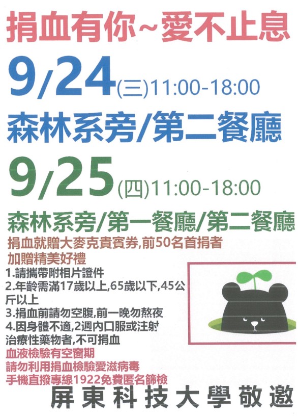 【校園捐血活動】捐血有您~愛不止息9/24(星期三)-9/25(星期四) 11:00-18:00