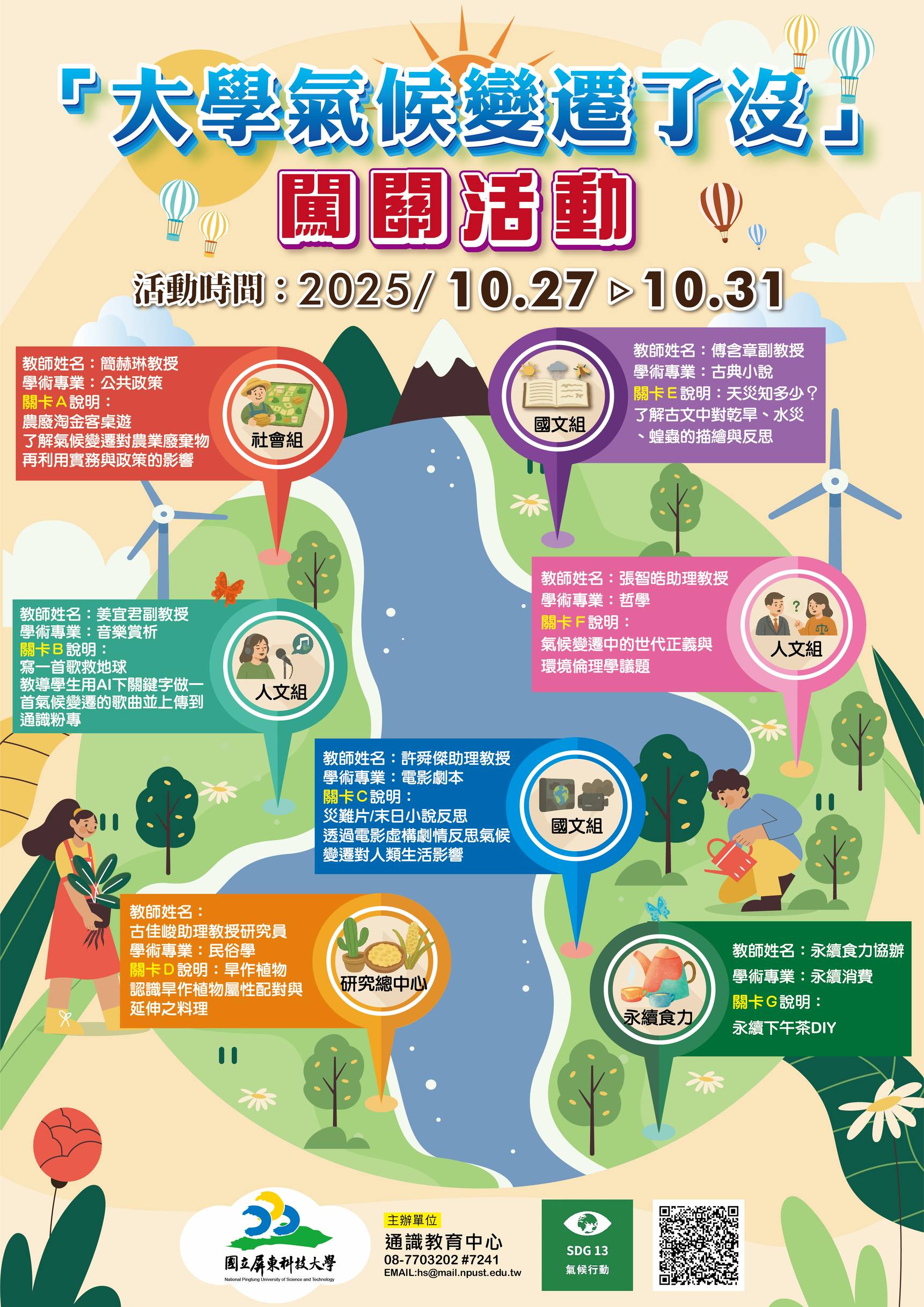 為提升本校大學生對氣候變遷這個重要新趨勢影響的知識層面、人文素養反思能力及跨領域應用,本SIG計畫規劃整合通識教育中心跨領域教師多元研究與教學成果,設計成為 「大學“氣候變遷”了沒」闖關系列活動。