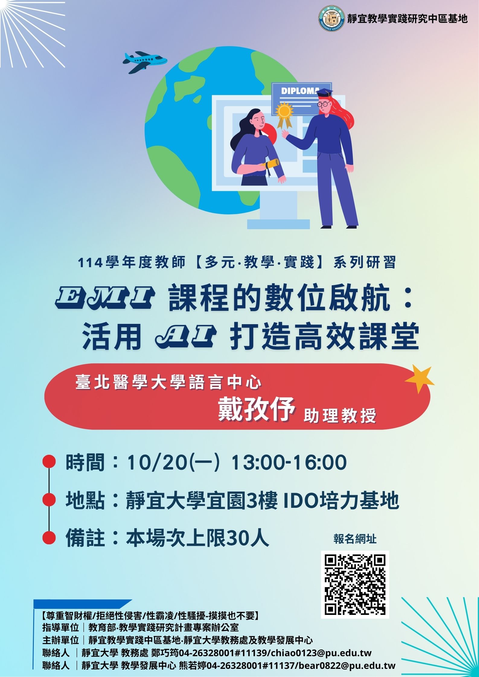 五、活動聯絡人:靜宜大學教務處鄭巧筠助理(電話:04-26328001分機11139,E-mail:chiao0123@pu.edu.tw)。