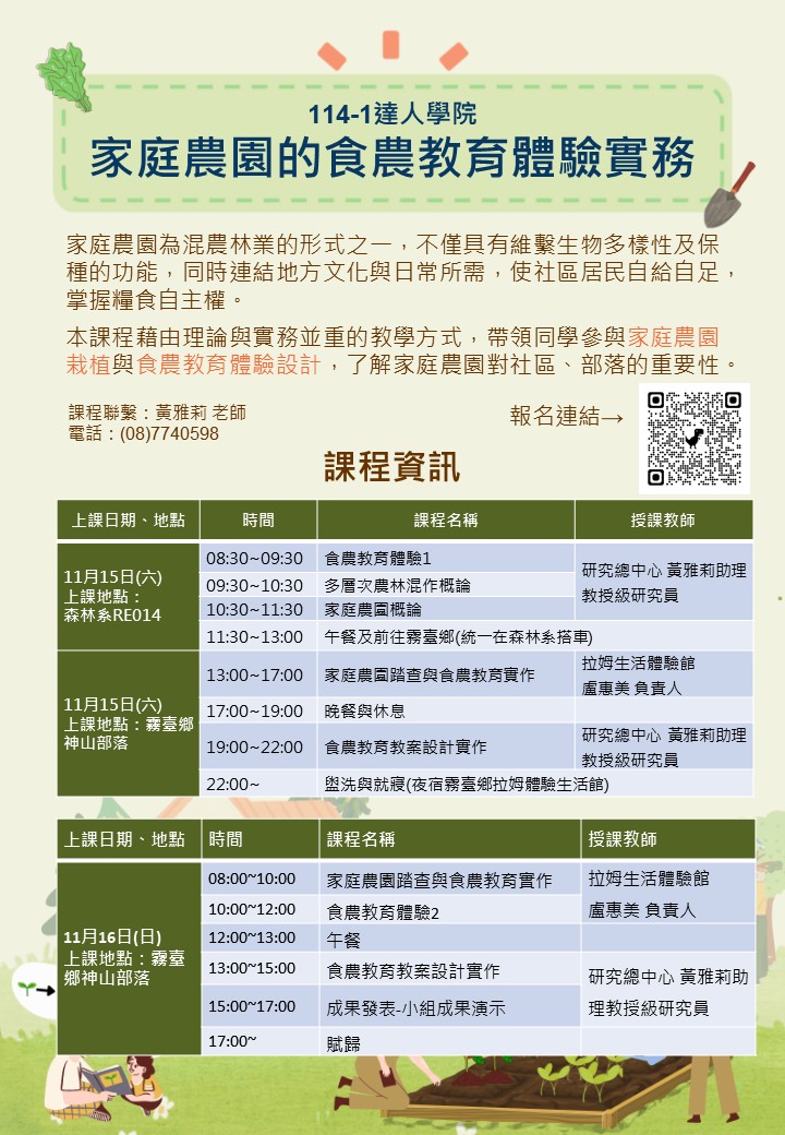 課程時間、地點、主題及講師: 1.11月15日(六) 地點:森林系RE014 講師:研究總中心 黃雅莉助理教授級研究員 08:30~09:30_食農教育體驗(1) 09:30~10:30_多層次農林混作概論 10:30~11:30_家庭農園概論 11:30~13:00_午餐及前往霧臺鄉(統一在森林系搭車) 2.11月15日(六) 地點:霧臺鄉神山部落 講師:拉姆生活體驗館 盧惠美負責人、研究總中心 黃雅莉助理教授級研究員 13:00~17:00_家庭農園踏查與食農教育實作 17:00~19:00_晚餐與休息 19:00~22:00_食農教育教案設計實作 22:00_盥洗與就寢(夜宿霧臺鄉拉姆體驗生活館) 3.11月16日(日) 地點:霧臺鄉神山部落 講師:拉姆生活體驗館 盧惠美負責人、研究總中心 黃雅莉助理教授級研究員 08:00~10:00_家庭農園踏查與食農教育實作 10:00~12:00_食農教育體驗(2) 12:00~13:00_午餐 13:00~15:00_食農教育教案設計實作 15:00~17:00_成果發表-小組成果演示 17:00_賦歸