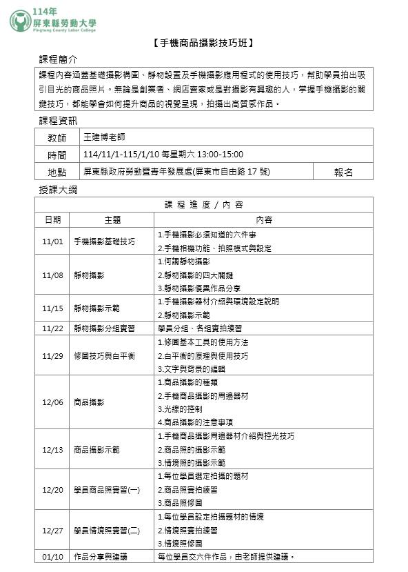 不必專業器材,就能拍出質感商品照 讓你的作品被更多人看見! -------------------------------------------- §報名資訊§ 課程時間:114/11/1-115/1/10每星期六13:00-15:00 地點:屏東縣政府勞青處(屏東市自由路17號) 學費:2400元 授課對象:年滿15歲,設籍、工作或就學於屏東縣一般民眾 洽詢電話:(08)7703202#7362 報名網址:https://pse.is/7x4q2e