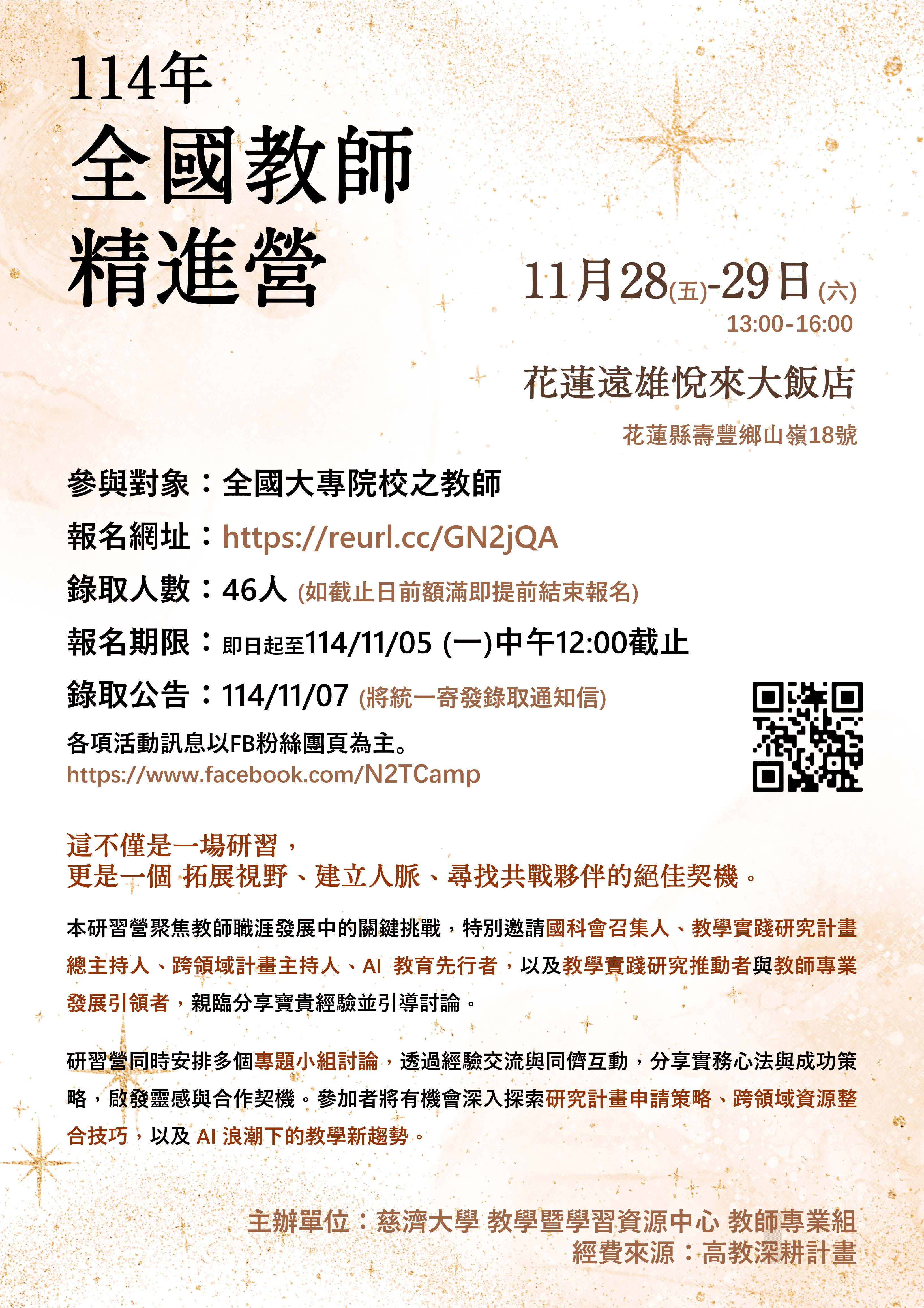 《研習活動》慈濟大學教師發展暨教學資源中心舉辦「114年全國教師精進營」,敬邀本校教師踴躍報名參加,報名至11月05日止