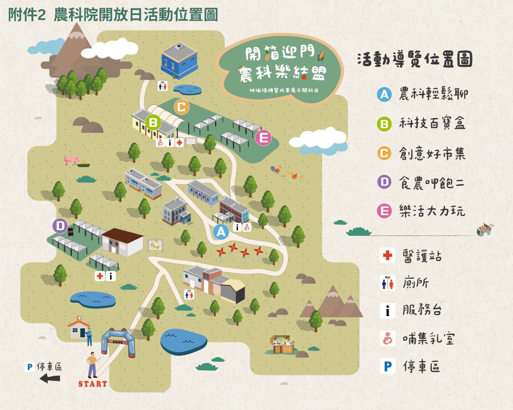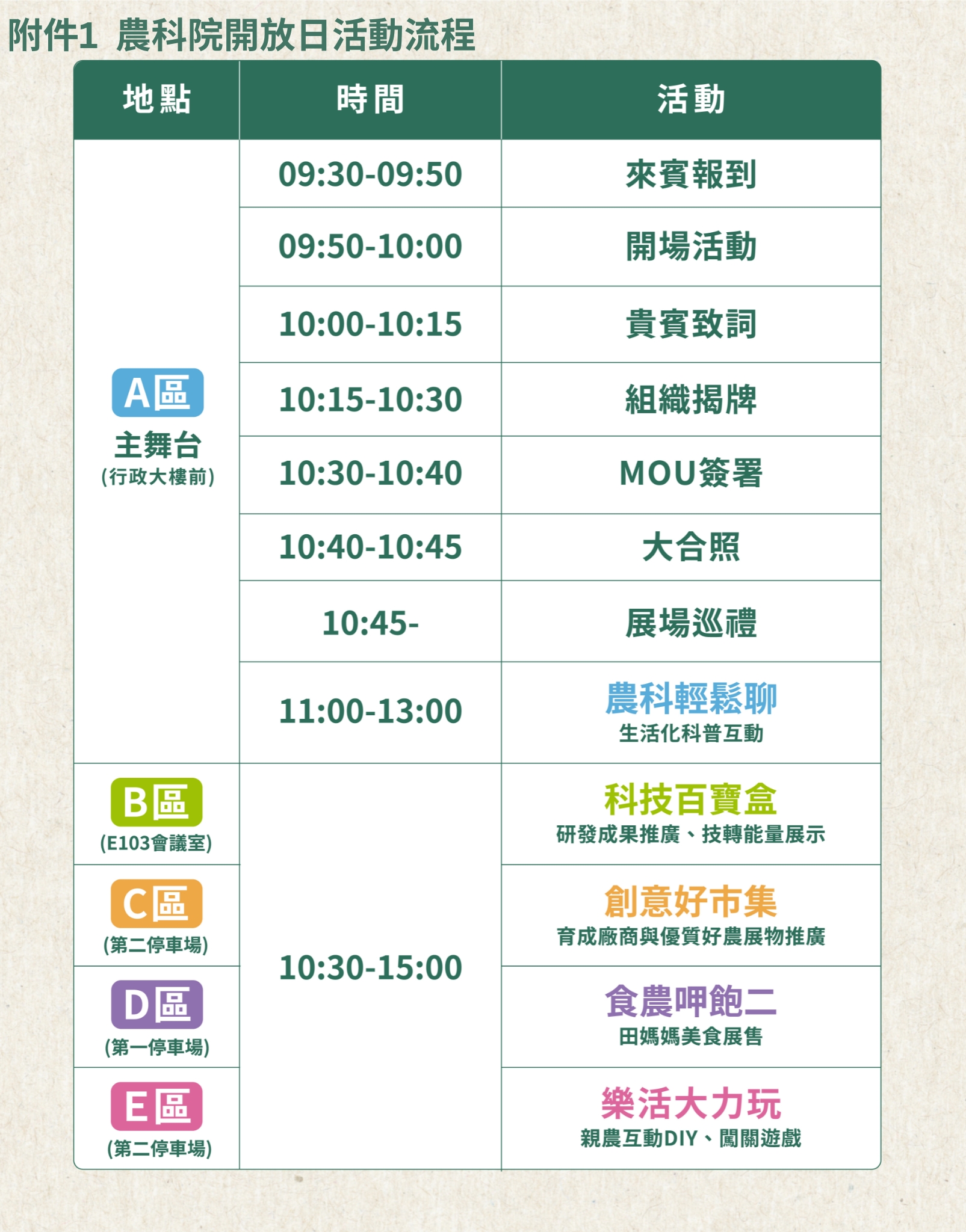 二、本活動設置「農科輕鬆聊」、「科技百寶盒」、「創意好市集」、「食農呷飽二」及「樂活大力玩」共5大主題活動區,邀集青農及本院育成廠商設攤,推廣優質農產品,並藉由互動闖關活動,活潑化農業科普知識,寓教於樂,是親子與食農活動的好去處。
