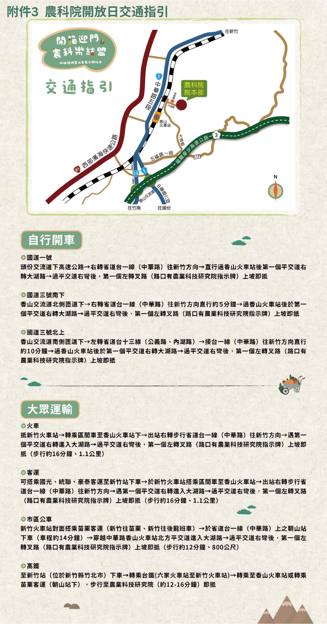 三、檢附活動流程、活動位置圖及交通指引各1份。另為便利參加人員往返,本院已於香山火車站備有接駁車,提供定點接送服務,每15分鐘發車,歡迎多加利用。