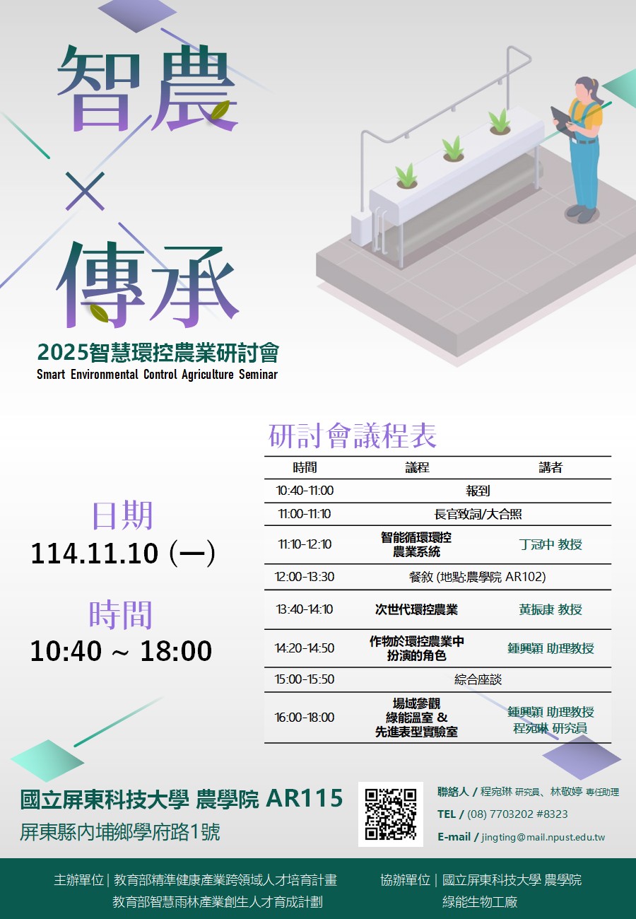 本座談會以「智慧環控」為核心,聚焦 AI、感測與環境控制在農業的整合應用。透過國內外專家專題演講、綜合座談與場域參訪,連結學研與產業經驗,呈現智慧農業在提升生產效率、降低資源耗用與推動永續上的實務價值與未來趨勢。 誠摯邀請您踴躍參與! 時間:114年11月10日(星期一)10:40~18:00 地點:屏東縣內埔鄉學府路1號農學院AR115視聽教室 (https://maps.app.goo.gl/Cg85XU9VtsWfrXiF9) 相關活動議程如附件 報名網址:https://forms.gle/QhrHJGsQ6wyTvFHT6 截止時間:114年11月03日(星期一) 主辦單位:教育部精準健康產業跨領域人才培育計畫、教育部智慧雨林產業創生人才育成計劃 協辦單位:國立屏東科技大學農學院、綠能生物工廠