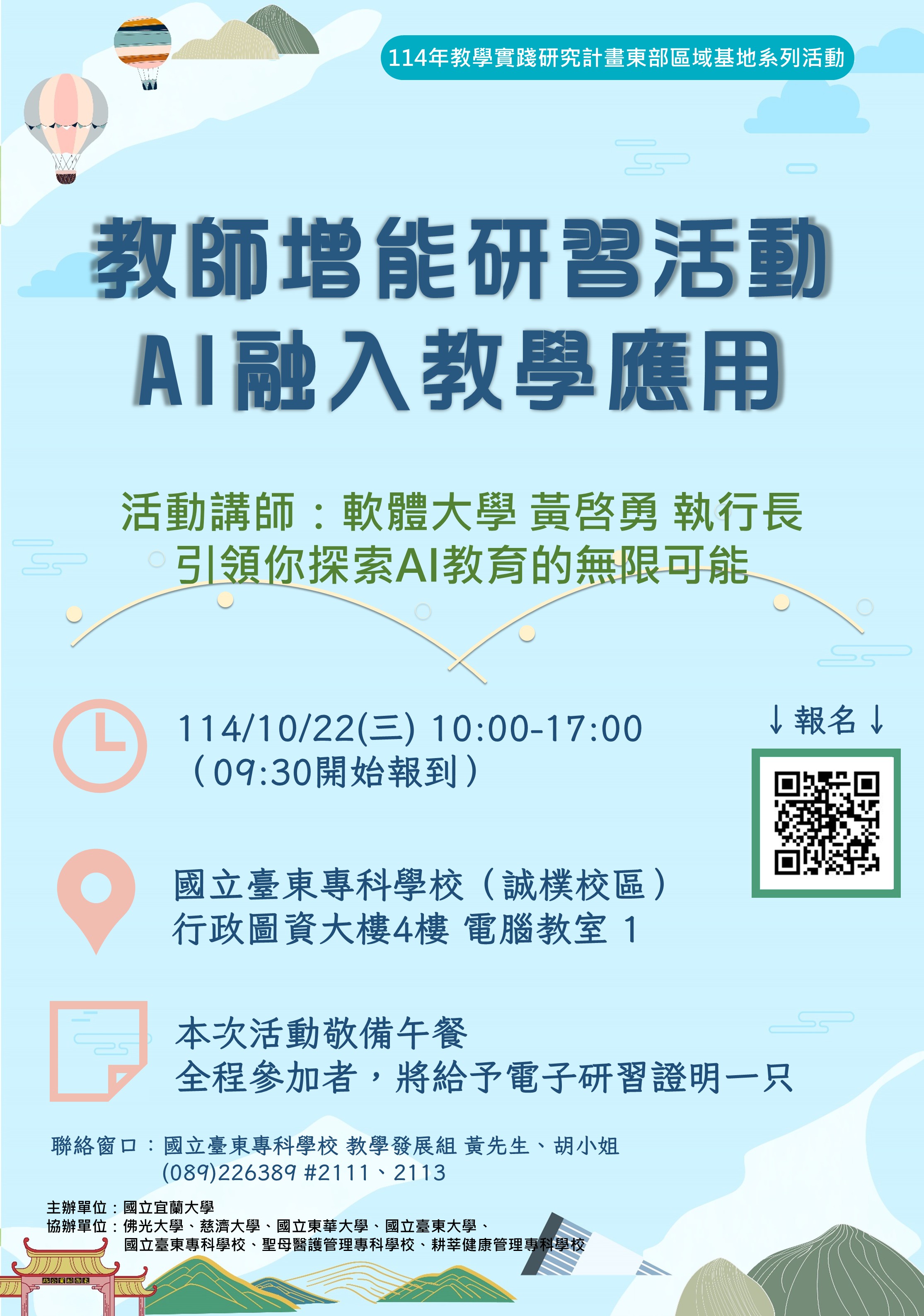 【教學實踐研究計畫】東區基地謹訂於114年10月22日及11月12日辦理「114年度教學 實踐研究計畫東區基地主題講座 」,敬邀本校教師踴躍參加。