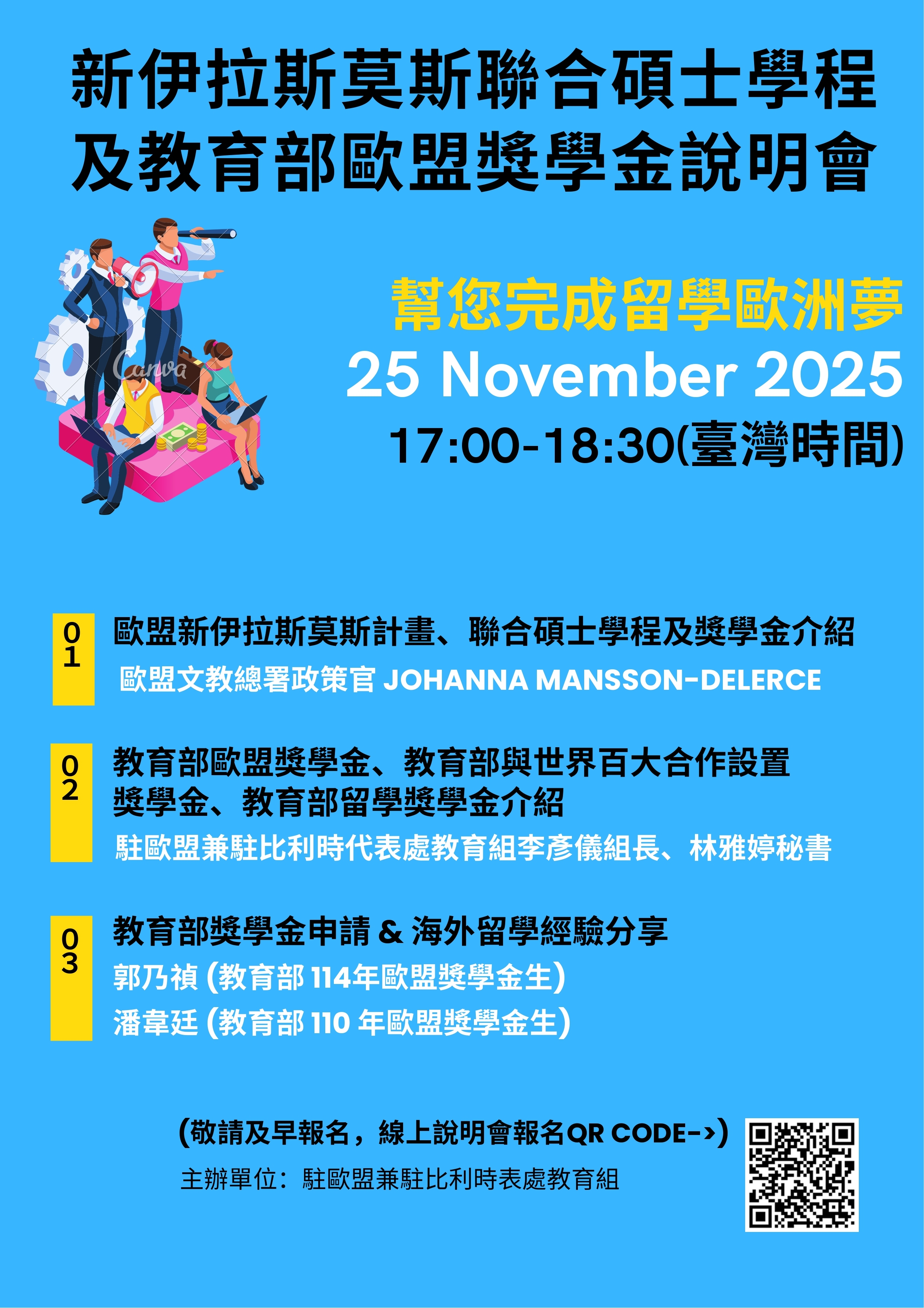 三、檢附說明會海報及簡介各1份,報名相關問題請逕洽該組(電子信箱:belgium@mail.moe.gov.tw)。