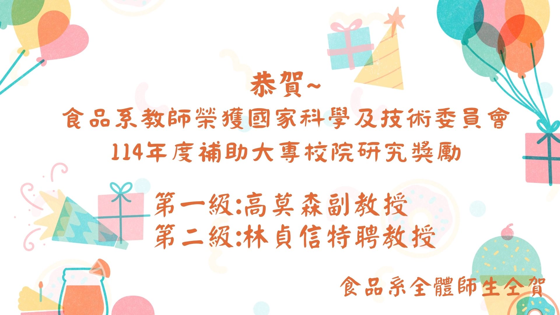 恭賀~ 食品系高莫森、林貞信老師榮獲國家科學及技術委員會114年度補助大專校院研究獎勵