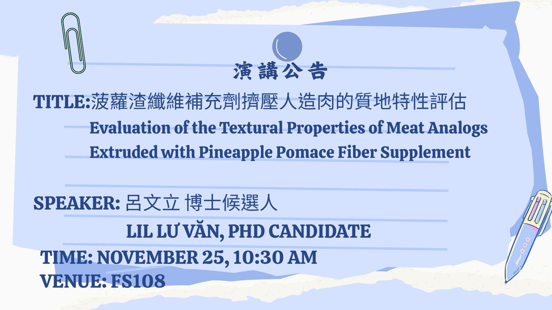 演講公告—菠蘿渣纖維補充劑擠壓人造肉的質地特性評估