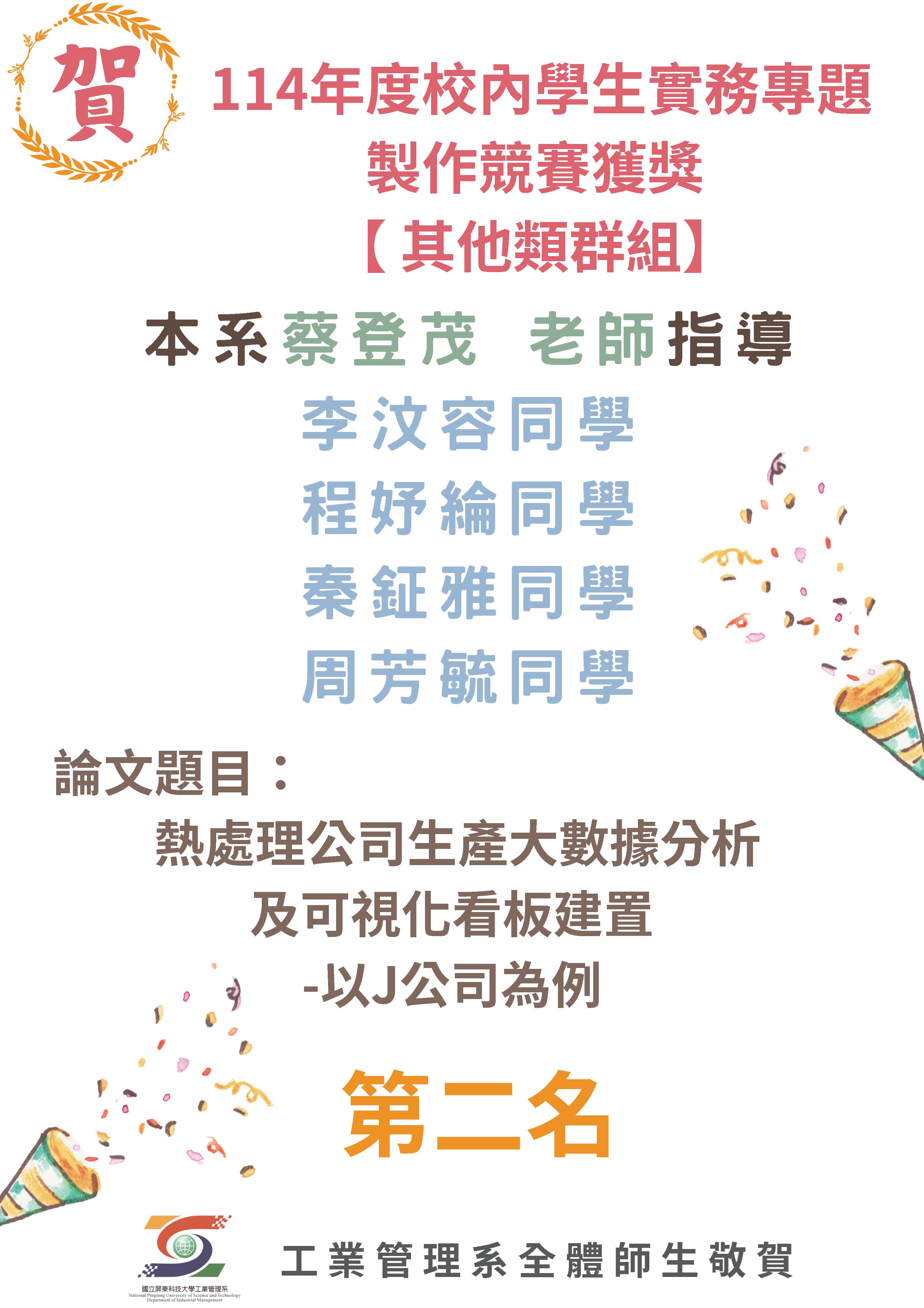 *~恭賀~* 工管系蔡登茂教授指導大學部學生參加「114年度校內學生實務專題製作競賽」榮獲佳績