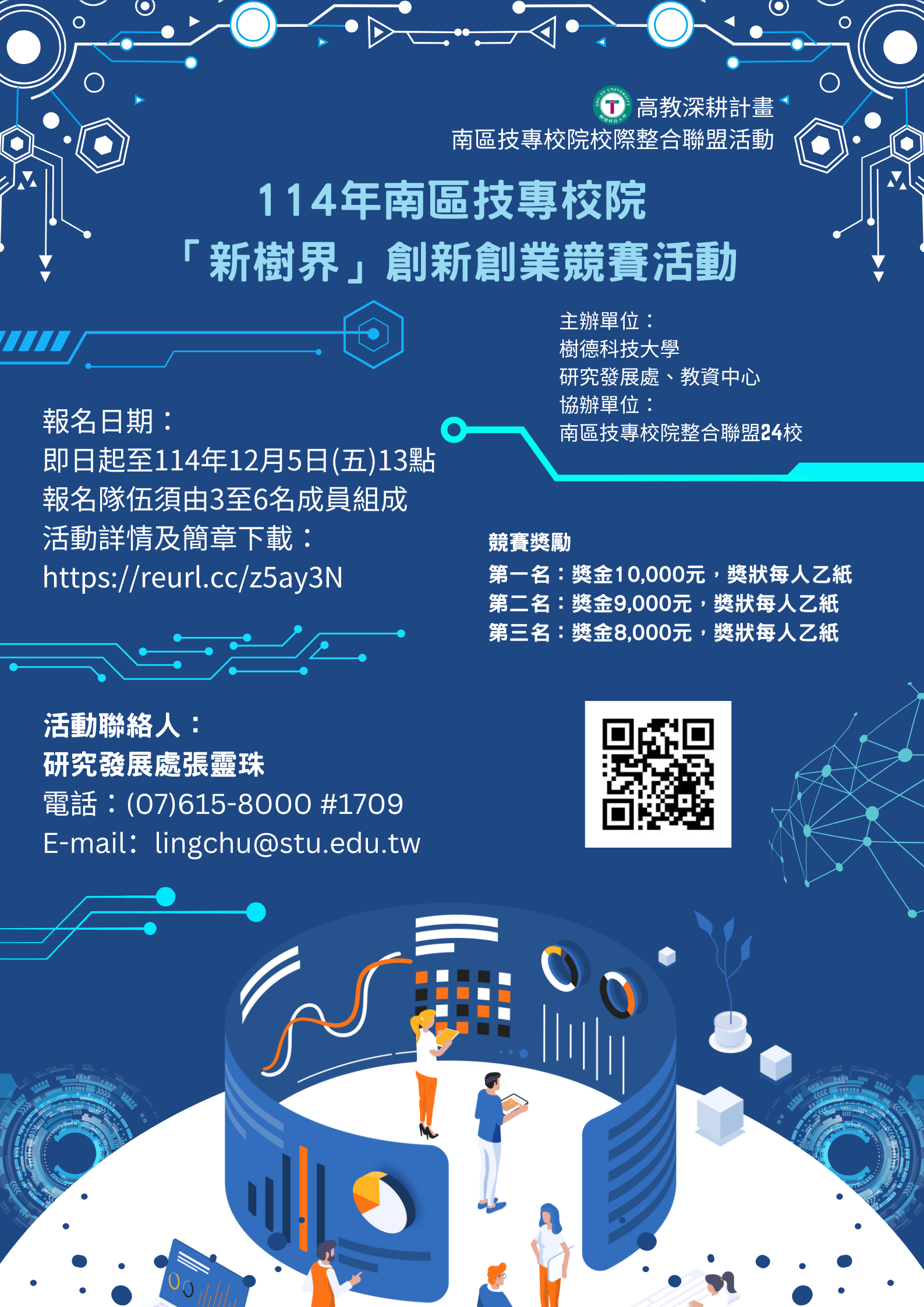 一、樹德科技大學研究發展處辦理「114年南區新樹界創新創業競賽」,旨在激發學生創新思維,培養創業實作能力,進而促進知識應用與價值創造。