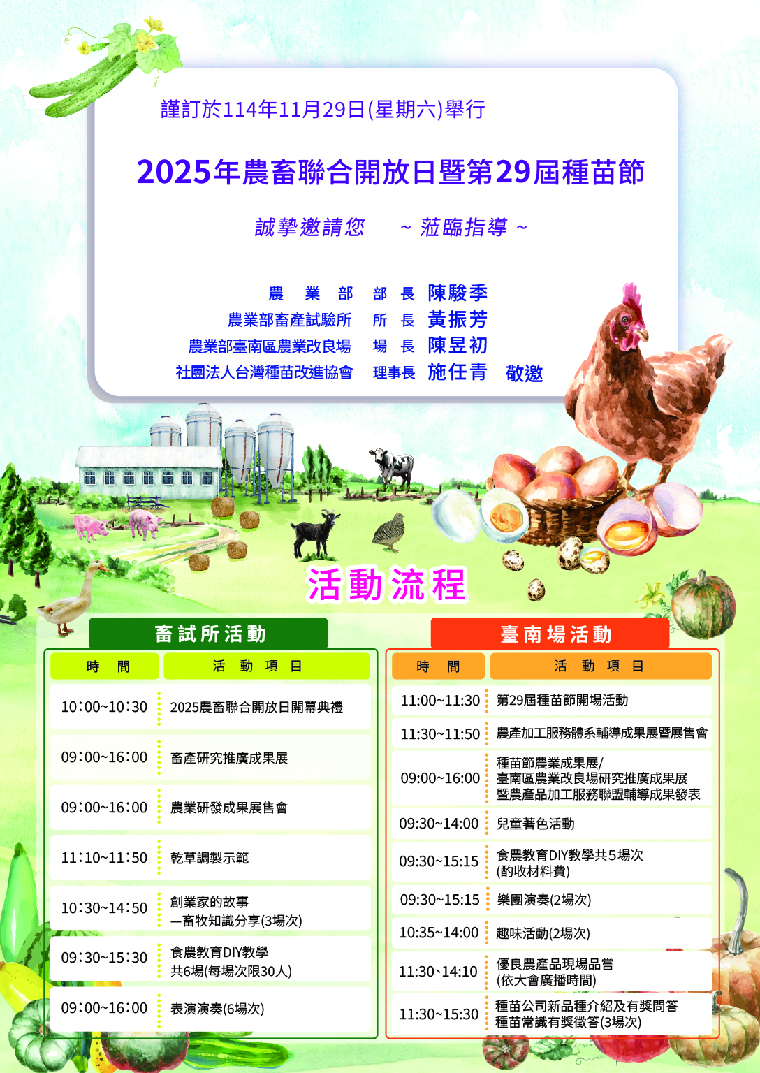 轉知:農業部臺南區農業改良場於114年11月29日(星期六)舉辦「2025農畜聯合開放日暨第29屆種苗節」活動,敬請蒞臨指導。