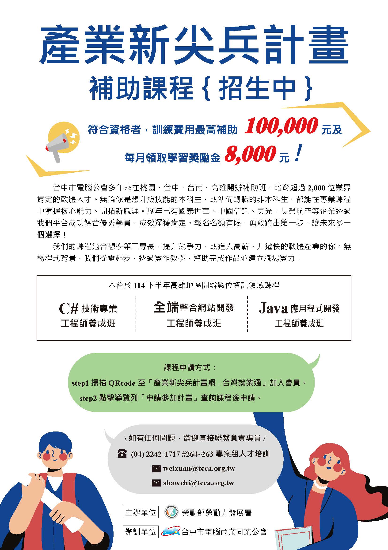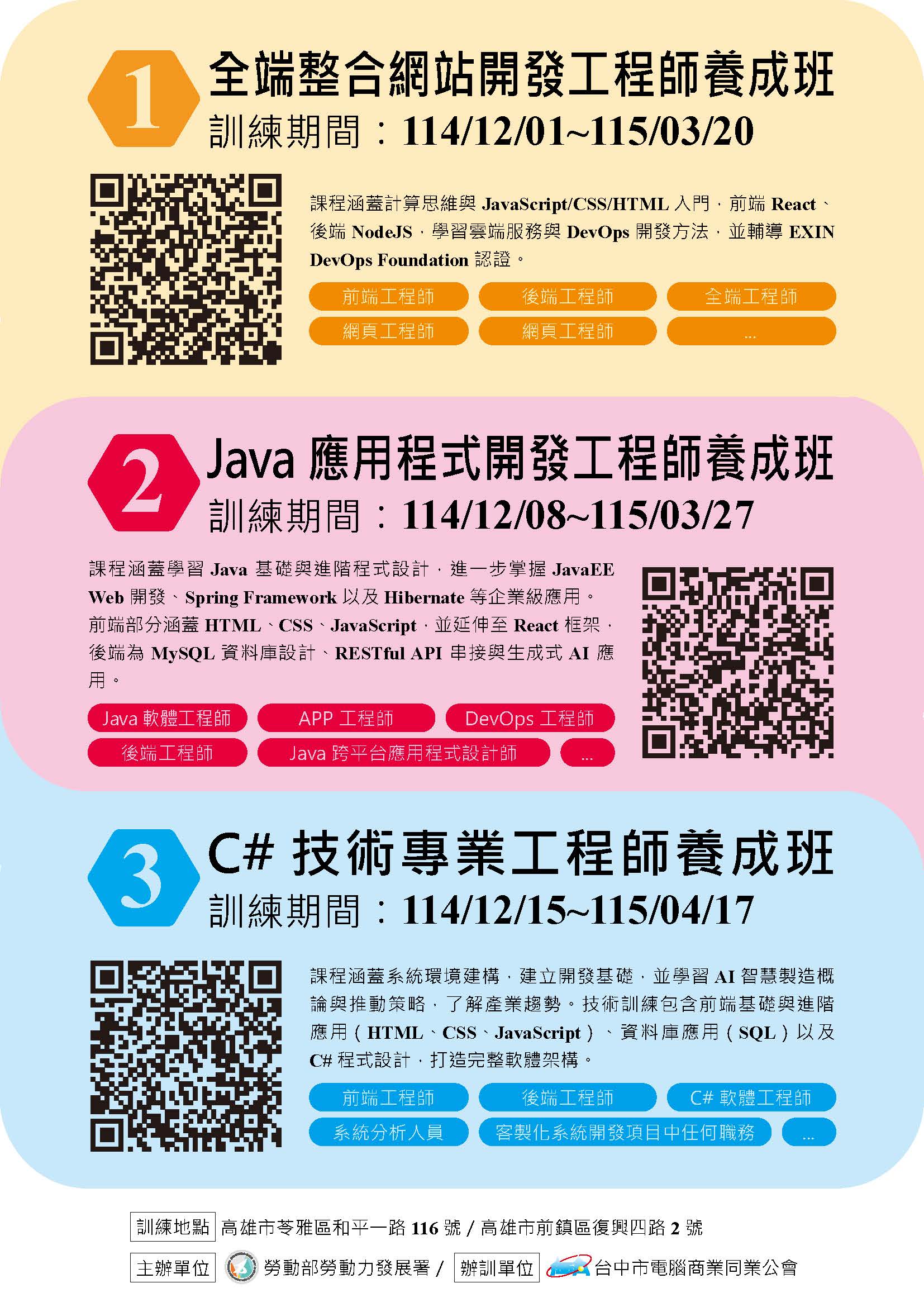 說明: 一、勞動部為培育青年具備新興產業技能,推動「產業新尖兵計畫」,協助15至29歲待業青年透過專業訓練銜接職場,提升就業力。 二、本會承辦勞動部「產業新尖兵計畫」,辦理以下專業課程: (一)全端整合網站開發工程師養成班第一梯次(114年12月1日至115年3月20日) 1、課程內容:學習前端React、後端NodeJS、雲端服務及DevOps,輔導EXIN DevOps認證,具備前後端開發與資料庫能力。 2、上課地點:高雄市苓雅區和平一路116號 3、課程網址:https://reurl.cc/nl0ZV8。 (二)Java應用程式開發工程師養成班第一梯次(114年12月8日至115年3月27日) 1、課程內容:掌握Java基礎與進階、Spring、Hibernate,前端React及資料庫管理,強化團隊協作與主流開發能力。 2、上課地點:高雄市苓雅區和平一路116號 3、課程網址:https://reurl.cc/6blLl5。 (三)C#技術專業工程師養成班第一梯次(114年12月15日至115年4月17日) 1、課程內容:學習C#程式、前端、SQL資料庫及AI智慧製造概論,強化資訊安全,具備完整前後端開發能力。 2、上課地點:高雄市前鎮區復興四路2號 3、課程網址:https://reurl.cc/mk9ZqG。 三、參訓學員可享全額政府補助訓練費用,並符合資格者可申請「學習獎勵金」每月最高8,000元。 四、結訓後,本會將協助學員就業或媒合相關職缺,協助青年順利進入產業。 五、檢附課程DM乙份。
