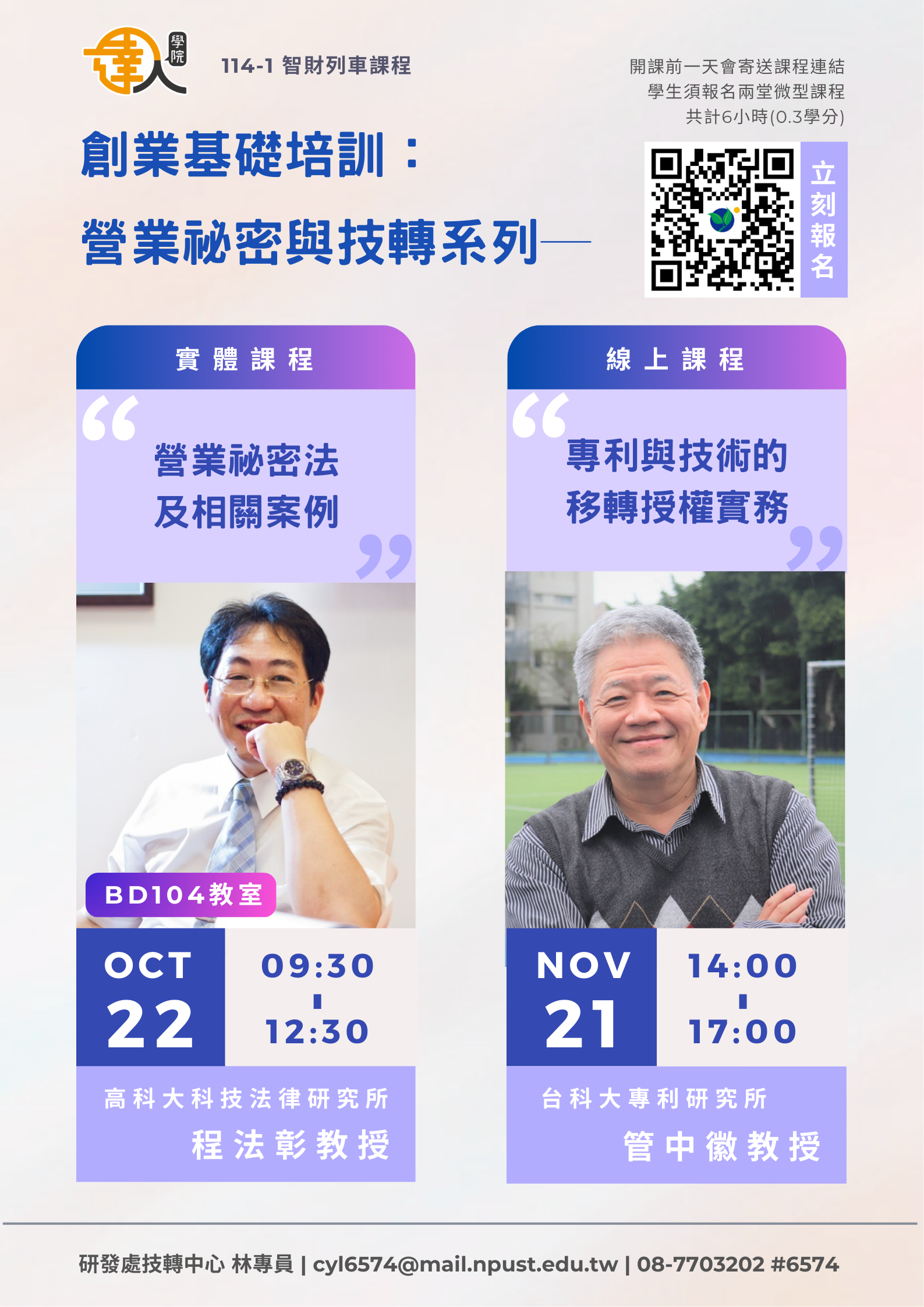 本校研究發展處明日(11月21日)辦理「2025智財列車-專利與技術的移轉授權實務」講座,敬請準時上線出席。
