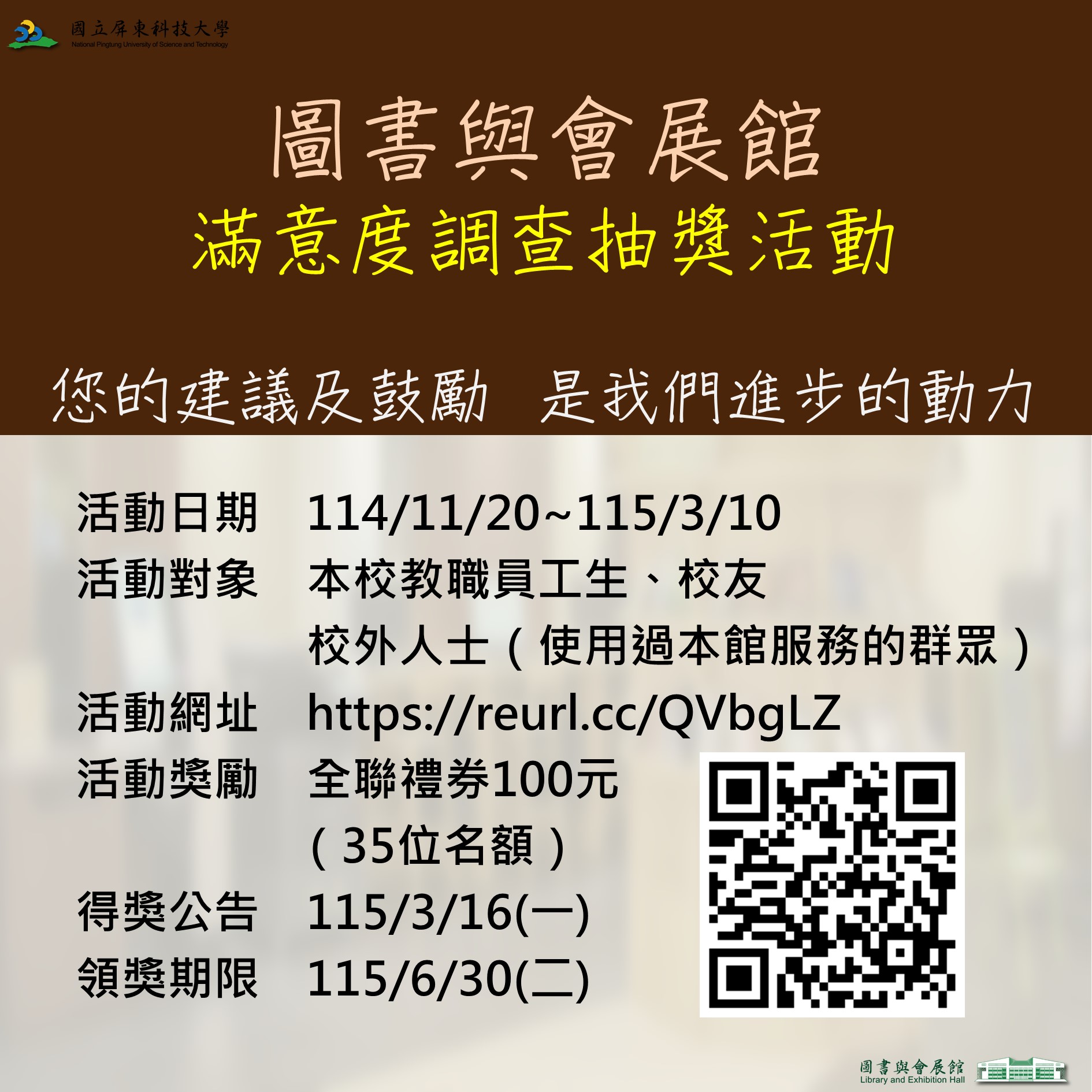 在回饋圖書館建議及鼓勵的同時,還有機會獲得獎品。 誠摯的邀請您提供寶貴的意見,歡迎大家踴躍來參加! .活動獎勵 全聯禮券100元(35位名額) .活動日期 114/11/20~115/3/10 .活動對象 本校教職員工生、校友、校外人士(使用過本館服務的群眾) .得獎公告 115/3/16(一)公告於本館社群平台 .領獎期限 115/6/30(二) .問卷網址 https://reurl.cc/QVbgLZ #目標收集600份以上 #請協助提供寶貴的意見 #感謝您的耐心填答 #您的建議及鼓勵是我們進步的動力 #屏科大圖書與會展館 #讀者滿意度調查 #抽獎活動