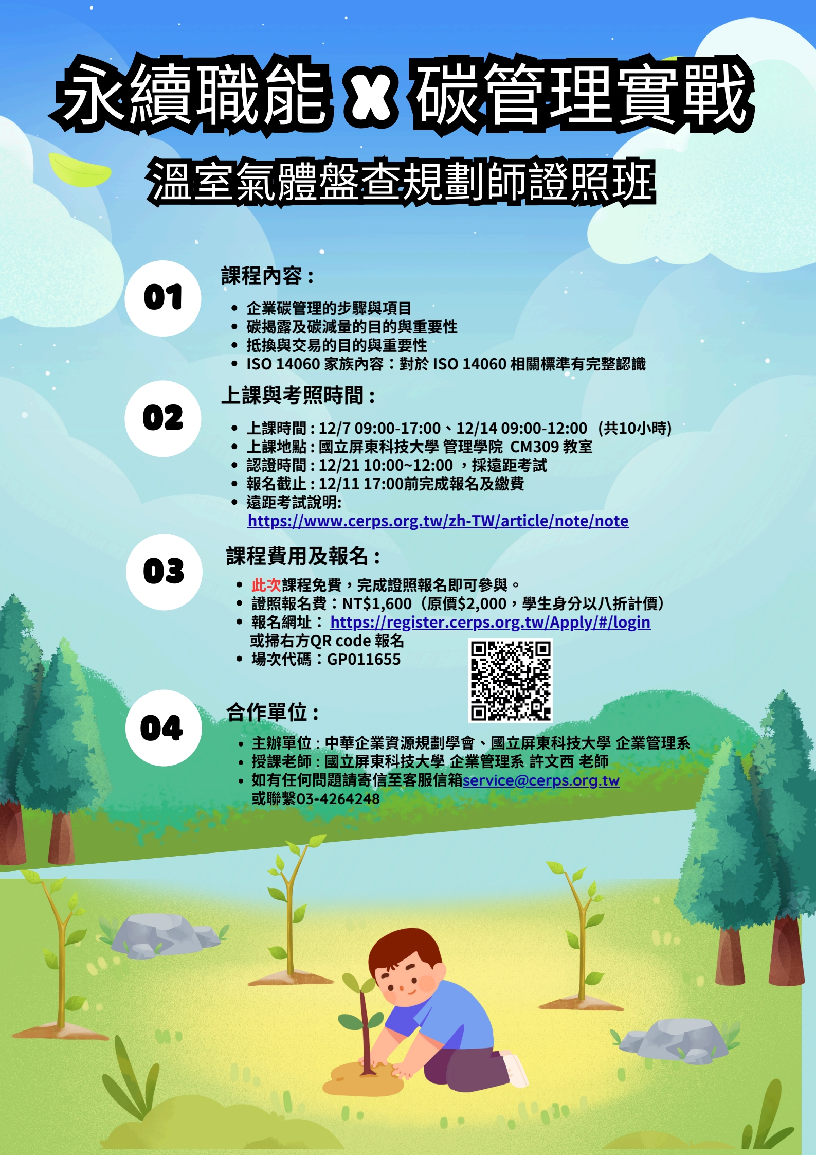 ・上課時間:12/7 09:00-17:00、12/14 09:00-12:00(共10小時) ・上課地點:國立屏東科技大學管理學院CM309教室 ・認證時間:12/2110:00〜12:00,採遠距考試 ・報名截止:12/1117:00前完成報名及繳費 ·遠距考試說明: https://www.cerps.org.tw/zh-TW/article/note/note