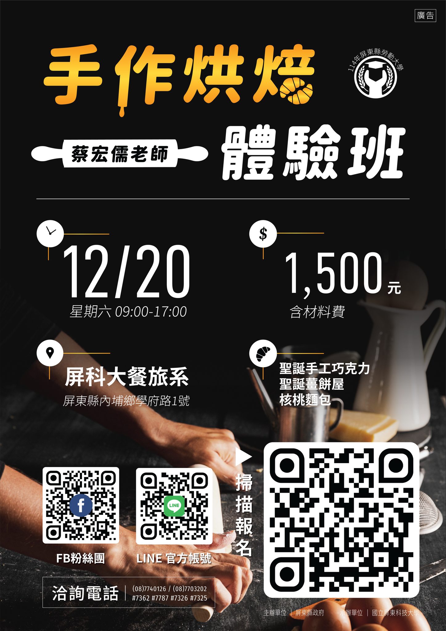 -------------------------------------------- §報名資訊§ 課程時間:12/20星期六9:00-17:00 地點:屏科大餐旅系(屏東縣內埔鄉學府路1號) 學費:1,500元(含材料費) 授課對象:年滿15歲,設籍、工作或就學於屏東縣一般民眾 洽詢電話:(08)7703202#7326 報名網址:https://pse.is/7x4q2e