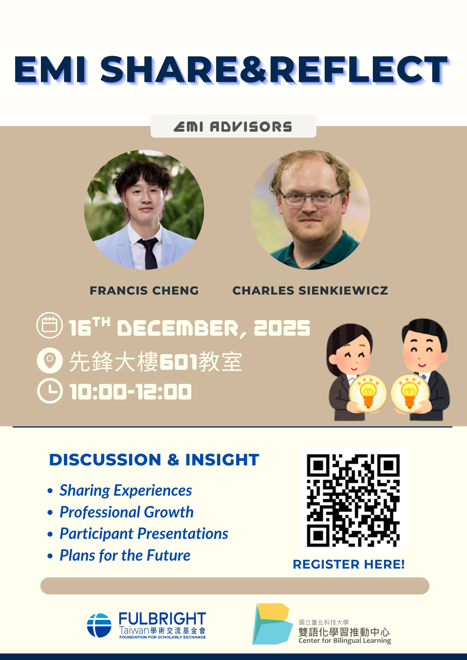 一、旨揭工作坊為本校雙語中心與Fulbright Taiwan學術交流基金會協同規劃之活動,透過美籍專業教學顧問辦理EMI教學增能工作坊,協助教師提升全英語授課之專業知 能,持續發展EMI課程之實務成效。