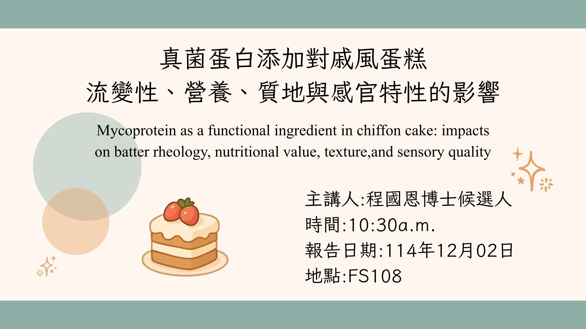 【演講公告】真菌蛋白添加對戚風蛋糕流變性、營養、質地與感官特性的影響~程國恩博士候選人