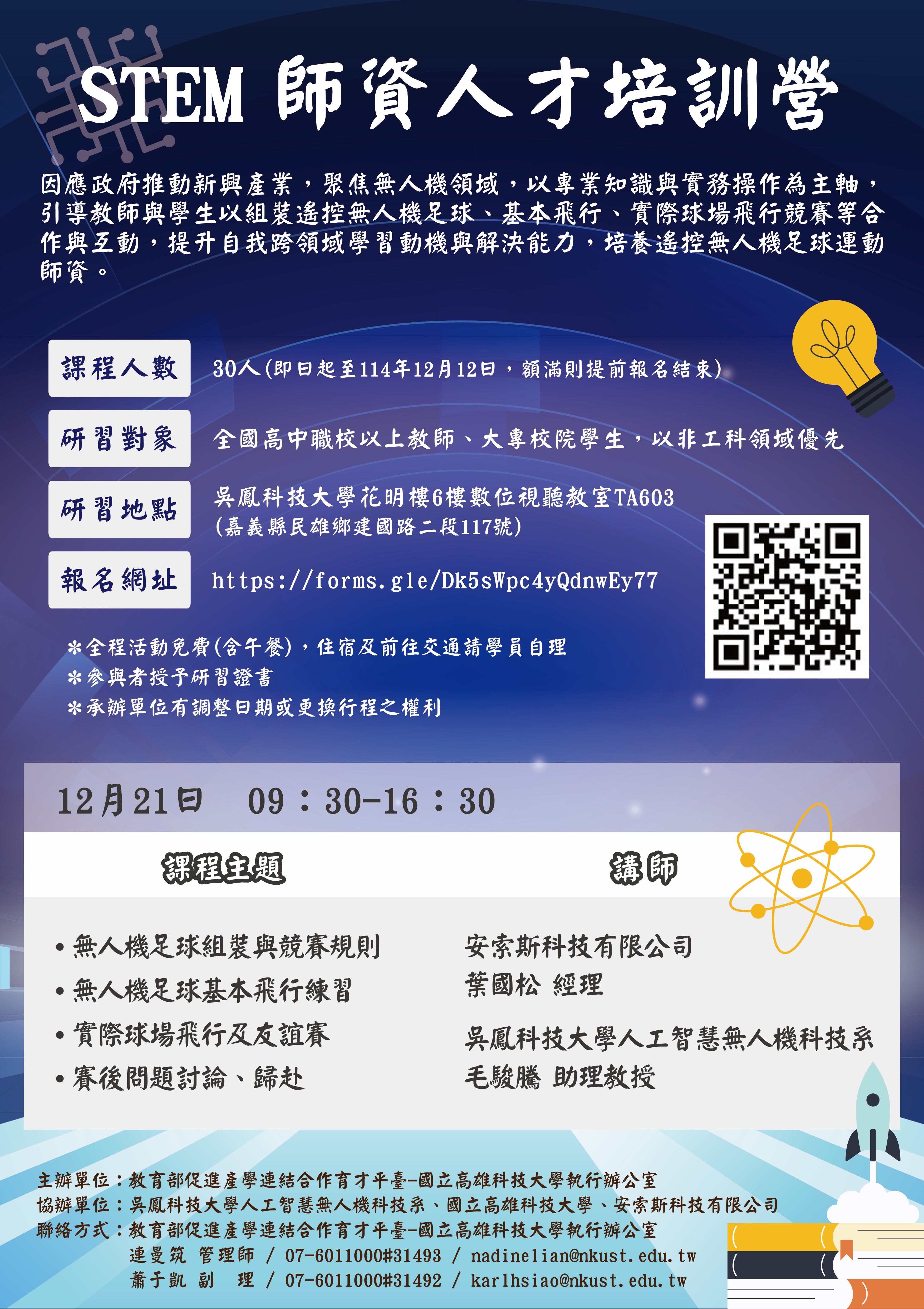 二、課程資訊: (一)課程日期:114年12月21日。 (二)課程地點:吳鳳科技大學。 (三)課程人數:上限30人(報名時間為即日起至114年12月12日,額滿則提前報名結束)。 (四)課程對象: 全國高中職校以上教師、大專校院學生。 (五)課程方式:實體面授。 (六)報名網址:https://forms.gle/Dk5sWpc4yQdnwEy77。 (七)注意事項 1、全程活動免費(含午餐),住宿及前往交通請自理。 2、全程參與者授予研習證書。 3、承辦單位有調整日期或更換行程之權利,