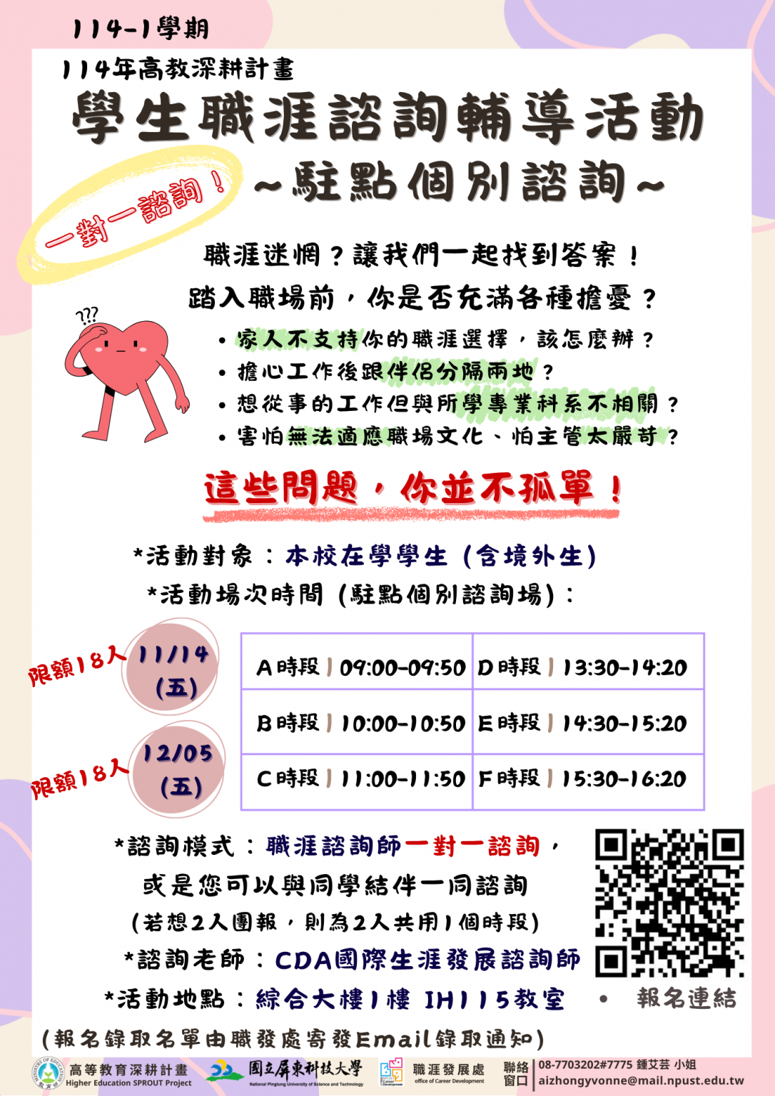 職涯發展處提供專業職涯諮詢,透過個人化解析、測評與專業引導,幫助你釐清迷惘、突破困境,讓你的職涯選擇更踏實、更自信!