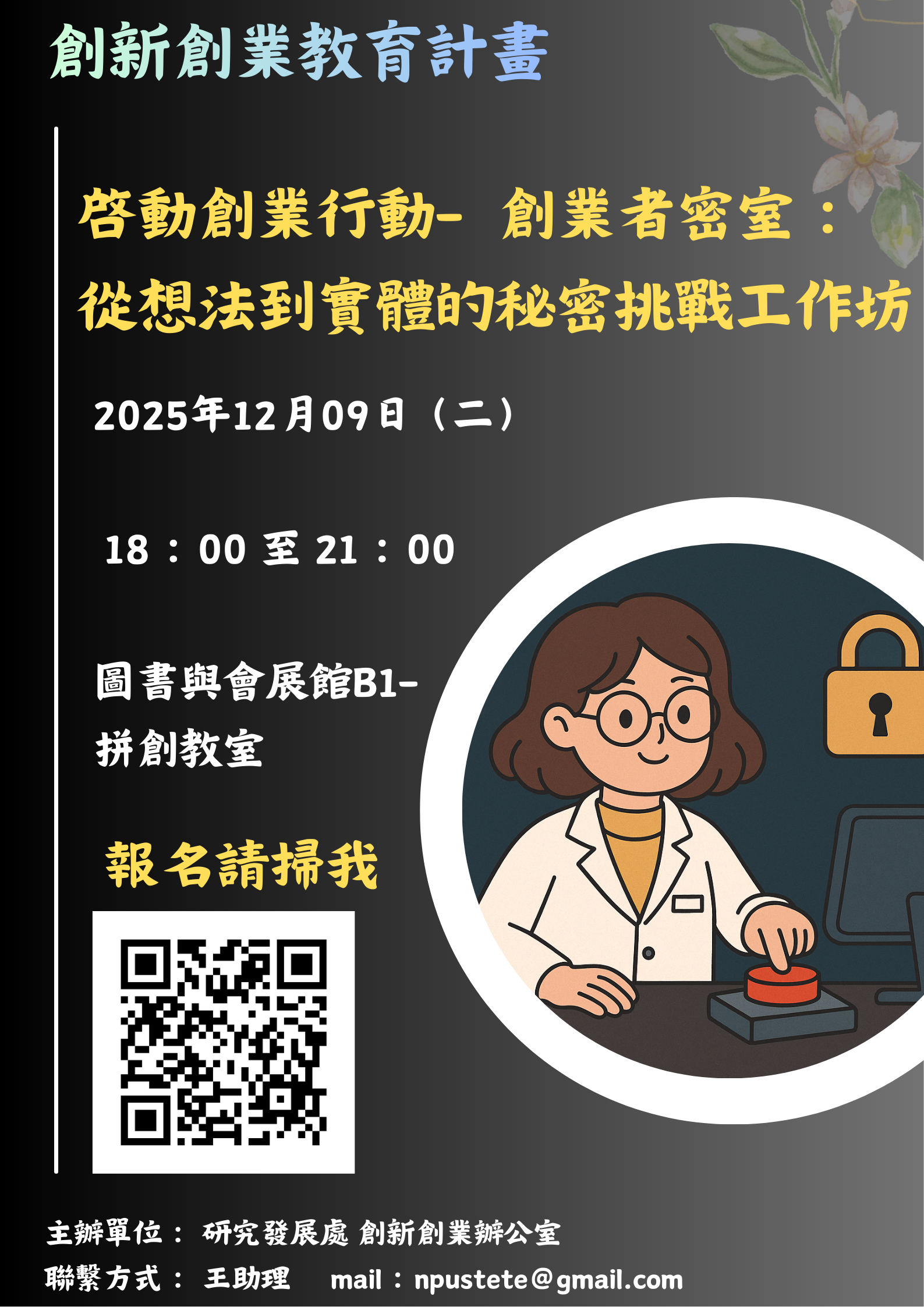 本校創新創業辦公室辦理「啓動創業行動-創業者密室:從想法到實體的秘密挑戰」工作坊,歡迎踴躍報名參加。