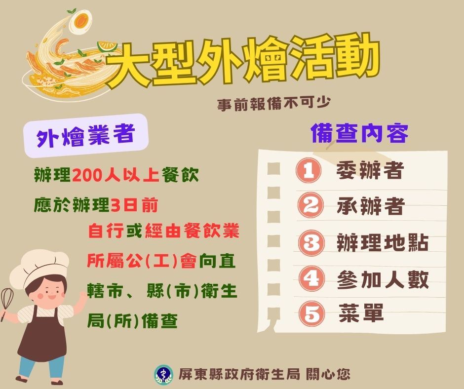 (表單下載處:屏東縣政府府衛生局首頁─業務資訊─食品藥政業務─食品安全─外燴業者餐飲報備專區)網址: https://www.ptshb.gov.tw/cp.aspx?n=B75180EC960E69A7