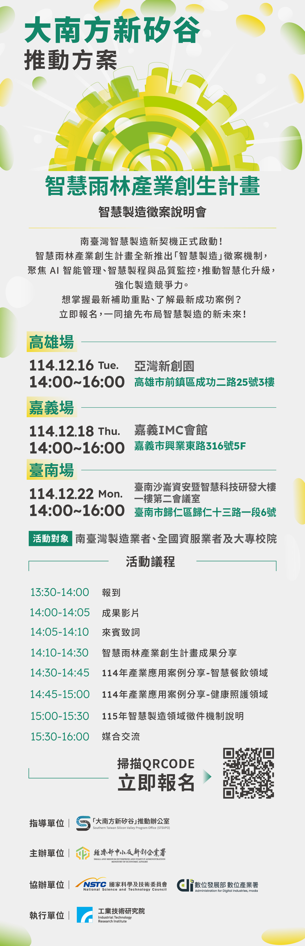 一、115年度智慧雨林產業創生計畫智慧製造徵案說明會,將於12/16(二)在高雄、12/18(四)在嘉義、12/22(一)在臺南舉行。 南臺灣智慧製造新契機正式啟動!智慧雨林產業創生計畫全新推出「智慧製造」徵案機制,聚焦 AI 智能管理、智慧製程與品質監控,推動智慧化升級,強化製造競爭力。 想掌握最新補助重點、了解最新成功案例?立即報名,一同搶先布局智慧製造的新未來!