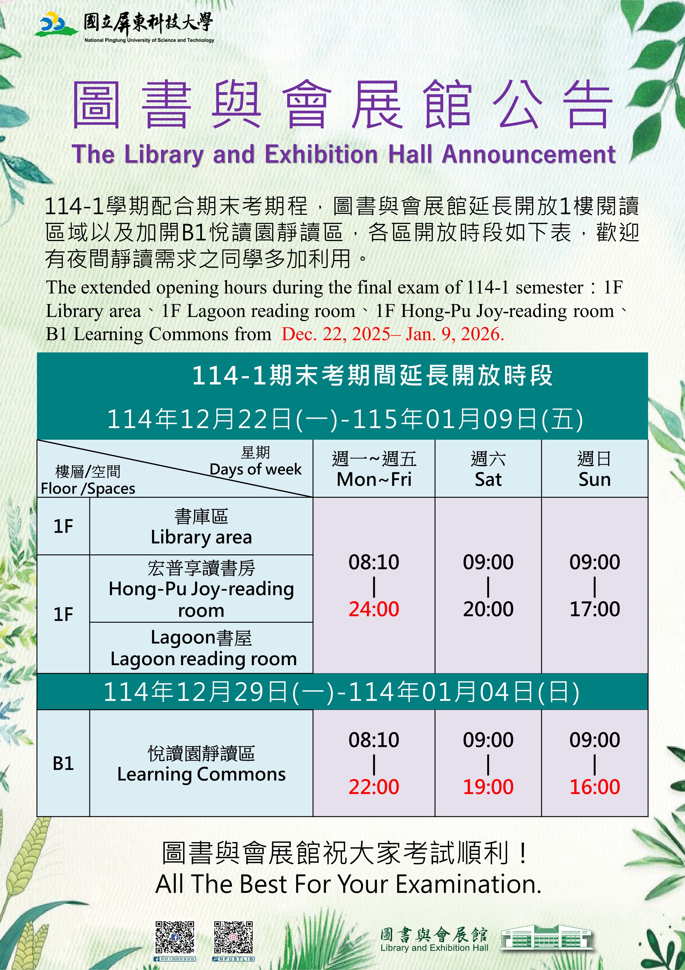【公告】配合本114-1學期期末考期程,本館延長開放1樓閱讀區域及加開B1悅讀園靜讀區,各區延長開放時段如圖卡,歡迎有夜間靜讀需求的同學們多加利用