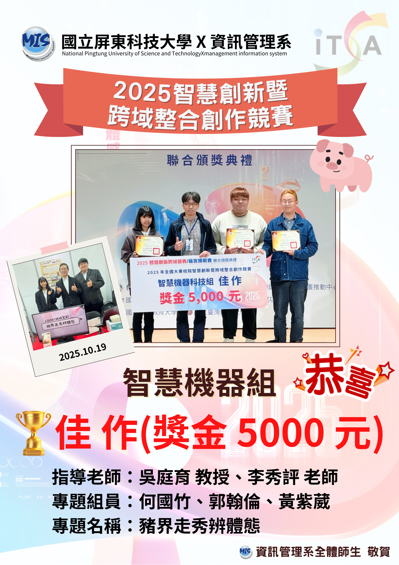 【資訊管理系】恭賀本系吳庭育教授指導學生何國竹、郭翰倫、黃紫葳參加「2025全國大專校院智慧創新暨跨域整合創作競賽」,榮獲【智慧機器科技組-佳作】獎項!!