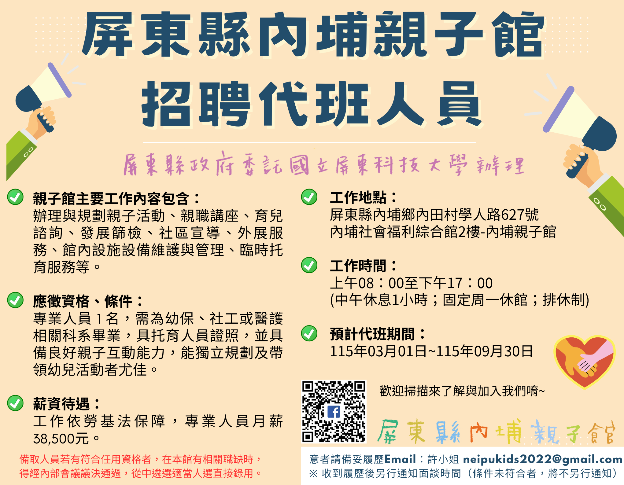#內埔親子館 #代班人員 #徵才 #親子館工作 #幼兒教保 #親子活動 #國立屏東科技大學