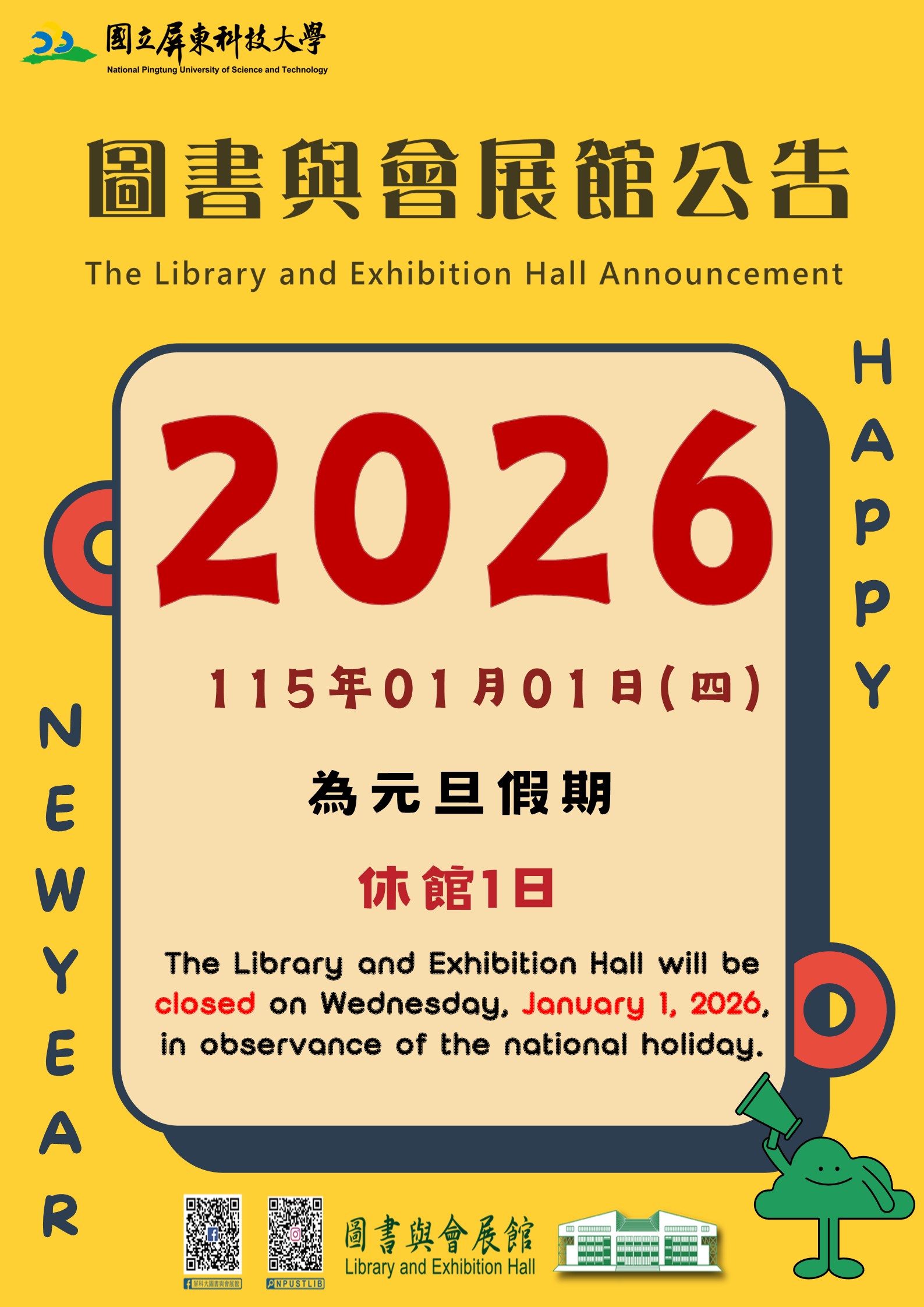 115年1月1日(四) 為國定假日,圖書與會展館休館1日。
