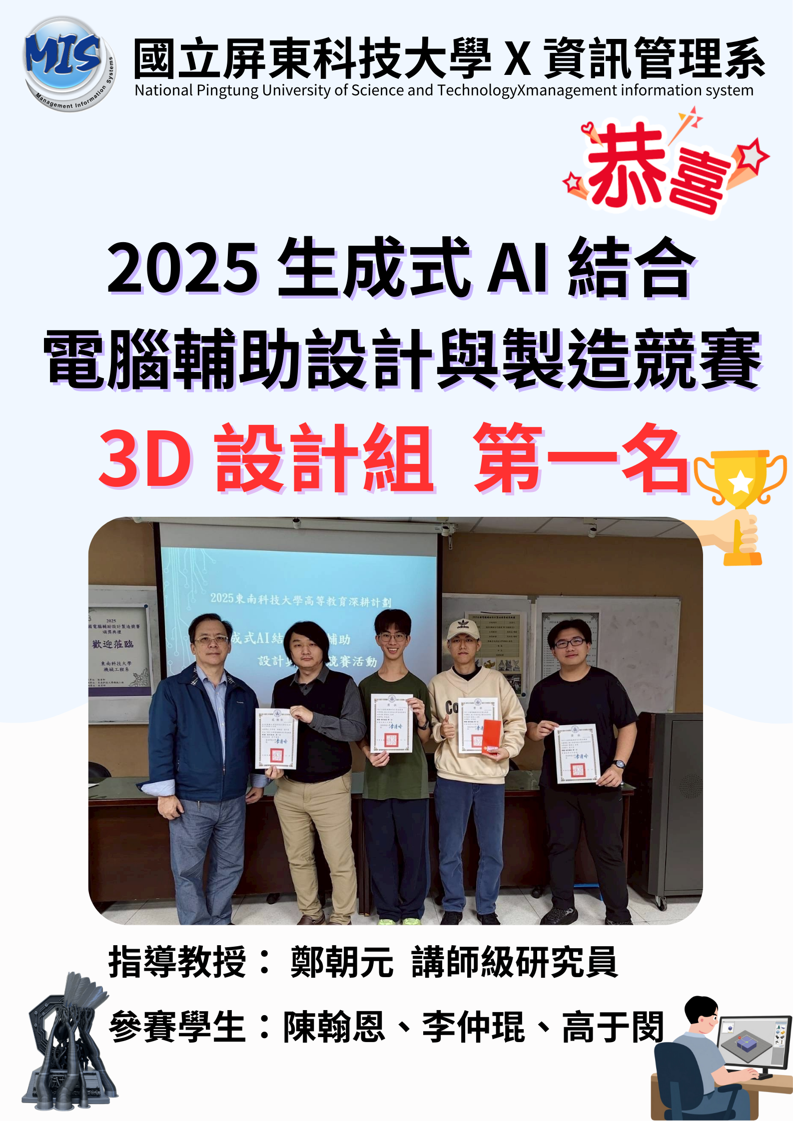 【恭賀】研究總中心鄭朝元講師級研究員指導本系陳翰恩、李仲琨、高于閔共3位同學,榮獲「2025生成式AI結合電腦輔助設計與製造競賽」3D設計組 第一名。