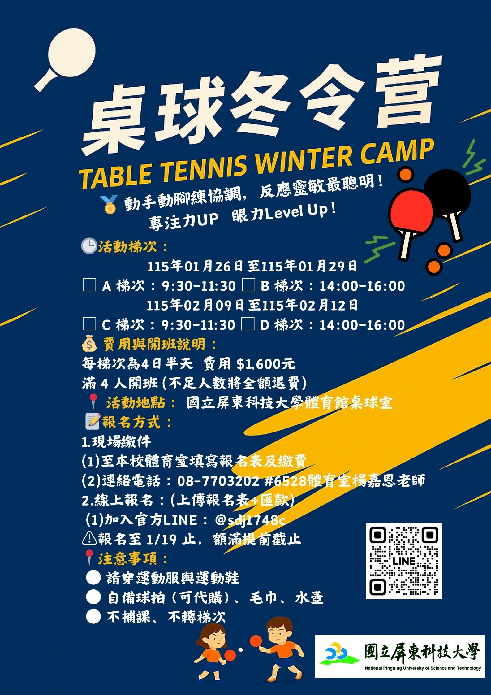 📅 活動日期: 1/26–1/29、2/9–2/12(共 8 天) 🕒 時段選擇: 上午 9:30–11:30/下午 14:00–16:00 👧👦 招收對象:4–11 歲學童 💰 費用:一期 4 天,每天半天,1,600 元 📍 地點:國立屏東科技大學體育館桌球室 📌 詳細內容請參考海報 📲 有興趣歡迎私訊或加入官方 LINE 詢問:@sdj1748c