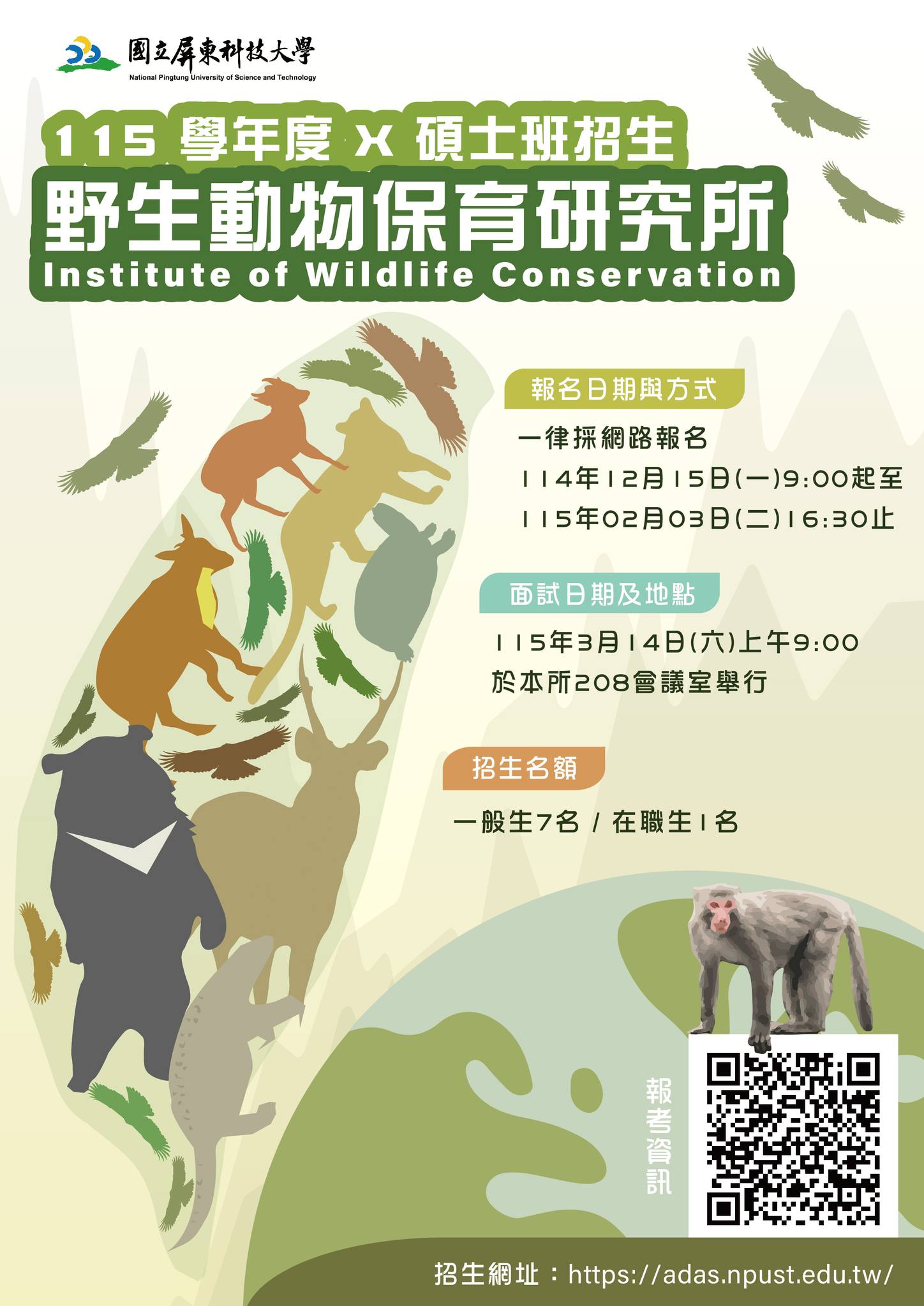 【野生動物保育研究所115碩士班】熱烈招生~ 報考資料以【掛號】 寄出,【報名繳費截止日】114年12月15日(一)至115年02月03日(二)以郵戳為憑。 招生網址:https://adas.npust.edu.tw/ ------------------------------------------------------ 1.報名日期與方式:一律採網路報名 114年12月15日(一)9:00起至115年02月03日(二)16:30止 2.面試日期及地點:115年03月14日(六)上午9:00於本所208會室舉行面試。 3.招生名額:一般生7名/在職生1名 ---------------------------------------------------- 你想更了解我們嗎?進來看看吧 https://wildlife.npust.edu.tw/ 更歡迎轉寄給對保育有興趣的伙伴! (相關訊息以招生簡章內容為準)