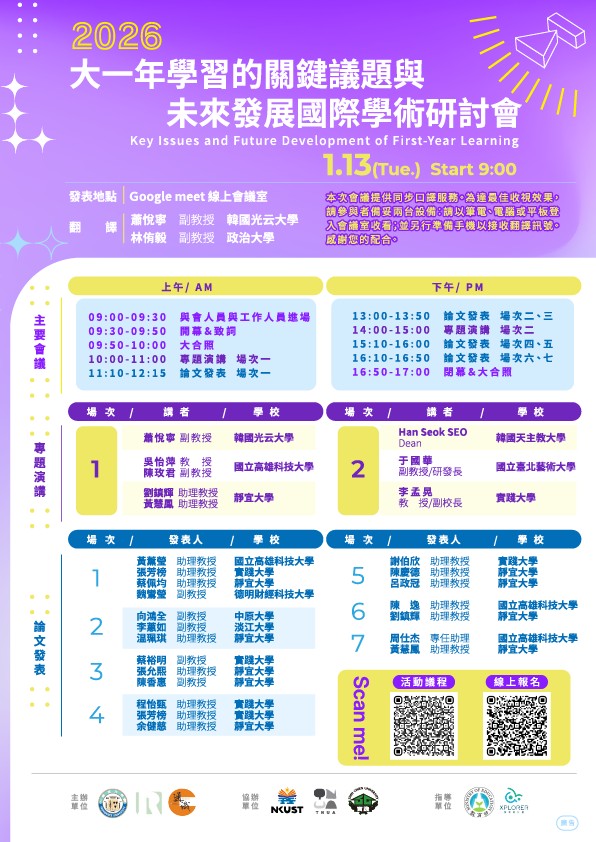 一、會議宗旨:邀請邀請國內外學者針對大一年課程學習、大一年學習之校務支持系統,以及大一學生之自主學習、學生學習適應、學生生涯與職涯發展等課題進行學術研討與交流。