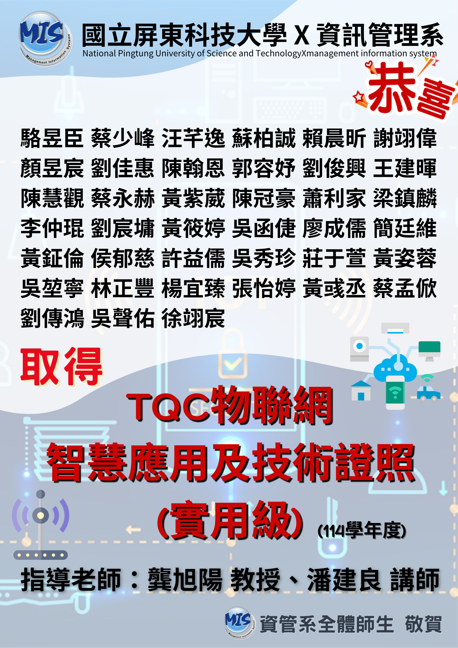 恭賀!! 本系龔旭陽教授、潘建良講師指導學生共39位考取TQC「物聯網智慧應用及技術(實用級)」證照。