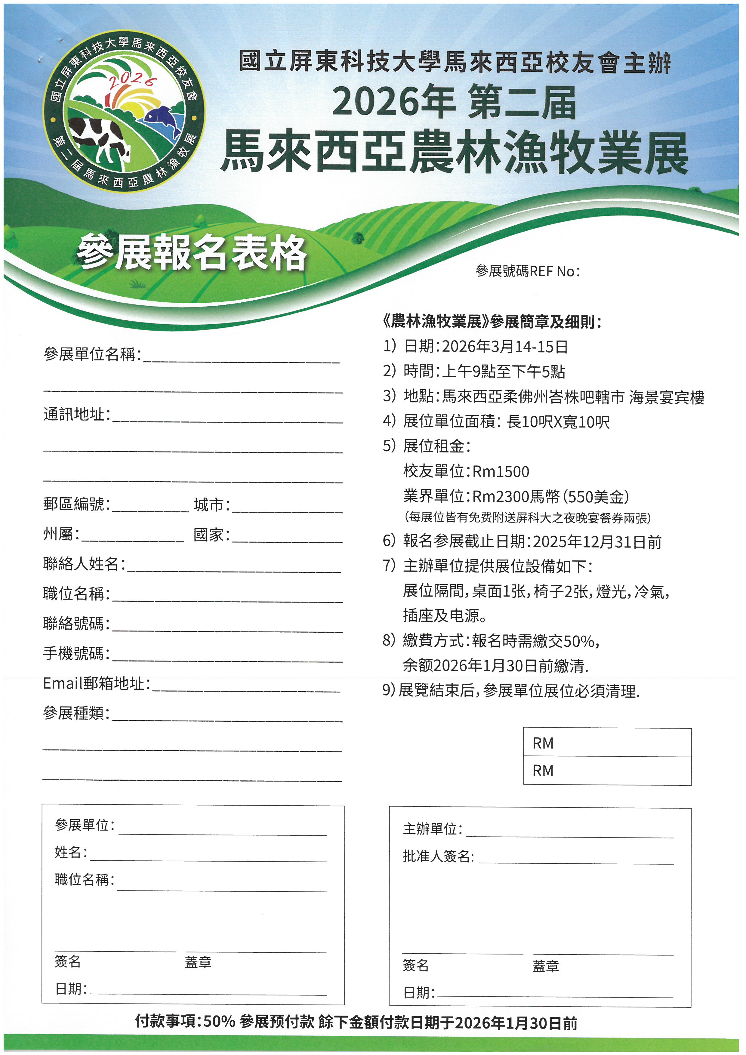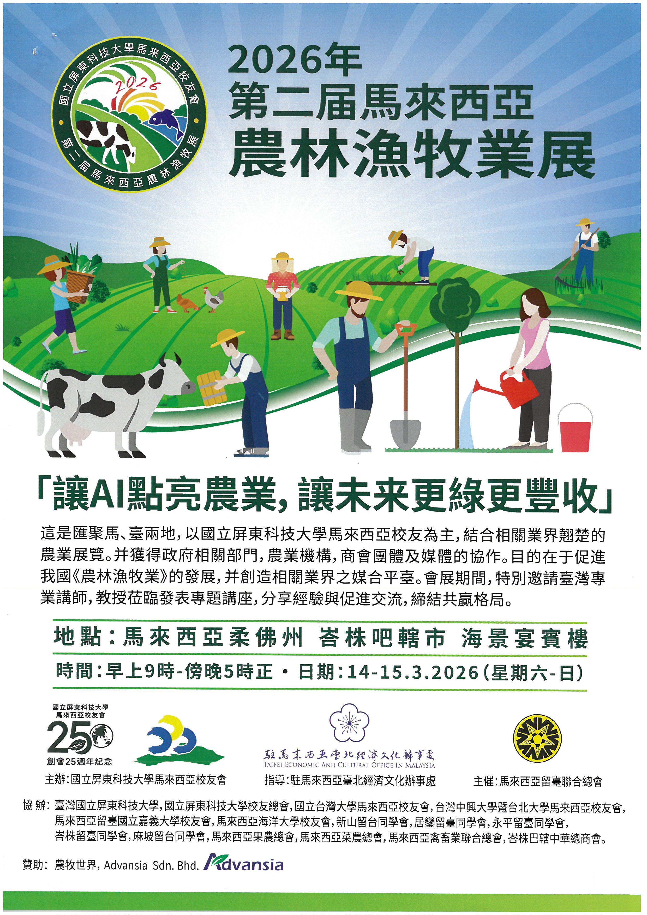 2026年第二屆馬來西亞農林漁牧業展 「讓AI點亮農業,讓未來更綠更豐收」 這是匯聚馬、臺兩地,以國立屏東科技大學馬來西亞校友為主,結合相關業界翹楚的農業展覽。並獲得政府相關部門、農業機構、商會團體及媒體的協作。目的在於促進馬來西亞《農林漁牧業》的發展,並創造相關業界之媒合平臺。會展期間,特別邀請臺灣專業講師、教授蒞臨發表專題講座,分享經驗與促進交流,締結共赢格局。 地點:馬來西亞柔佛州 峇株吧轄市 海景宴賓樓 時間:9:00-17:00 日期:2026年3月14日至15日 主辦:國立屏東科技大學馬來西亞校友會 指導:駐馬來西亞臺北經濟文化辦事處 主催:馬來西亞留臺聯合總會 協辦:國立屏東科技大學、國立屏東科技大學校友總會、國立台灣大學馬來西亞校友會、中興大學暨台北大學馬來西亞校友會、馬來西亞留臺國立嘉義大學校友會、馬來西亞海洋大學校友會、新山留台同學會、居鑾留臺同學會、永平留臺同學會、峇株留臺同學會、麻坡留臺同學會、馬來西亞果農總會、馬來西亞菜農總會、馬來西亞禽畜業聯合總會、峇株巴辖中華總商會。 贊助:農牧世界、Advansia Sdn. Bhd.