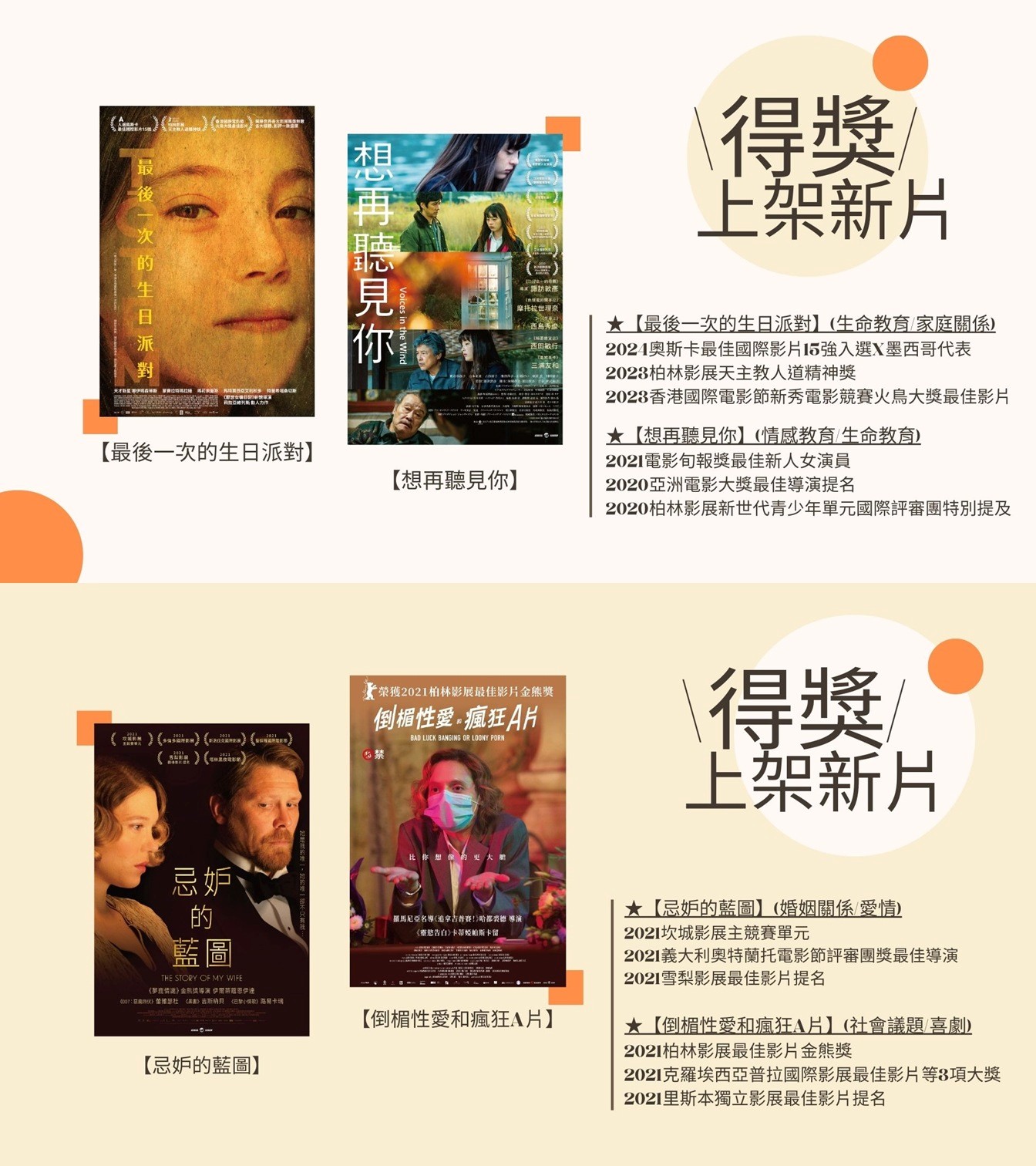 **1月新上架影片:13片 1.老鬼當家 2.想再聽見你 3.貓山王中王 4.喜歡妳是妳 5.天才狂歡派對:首部曲 6.天才狂歡派對:最終章 7.森林守護者 8.皮埃爾神父的生命旅程 9.兩個世界 10.最後一次的生日派對 11.愛的缺口 12.忌妒的藍圖 13.倒楣性愛和瘋狂A片