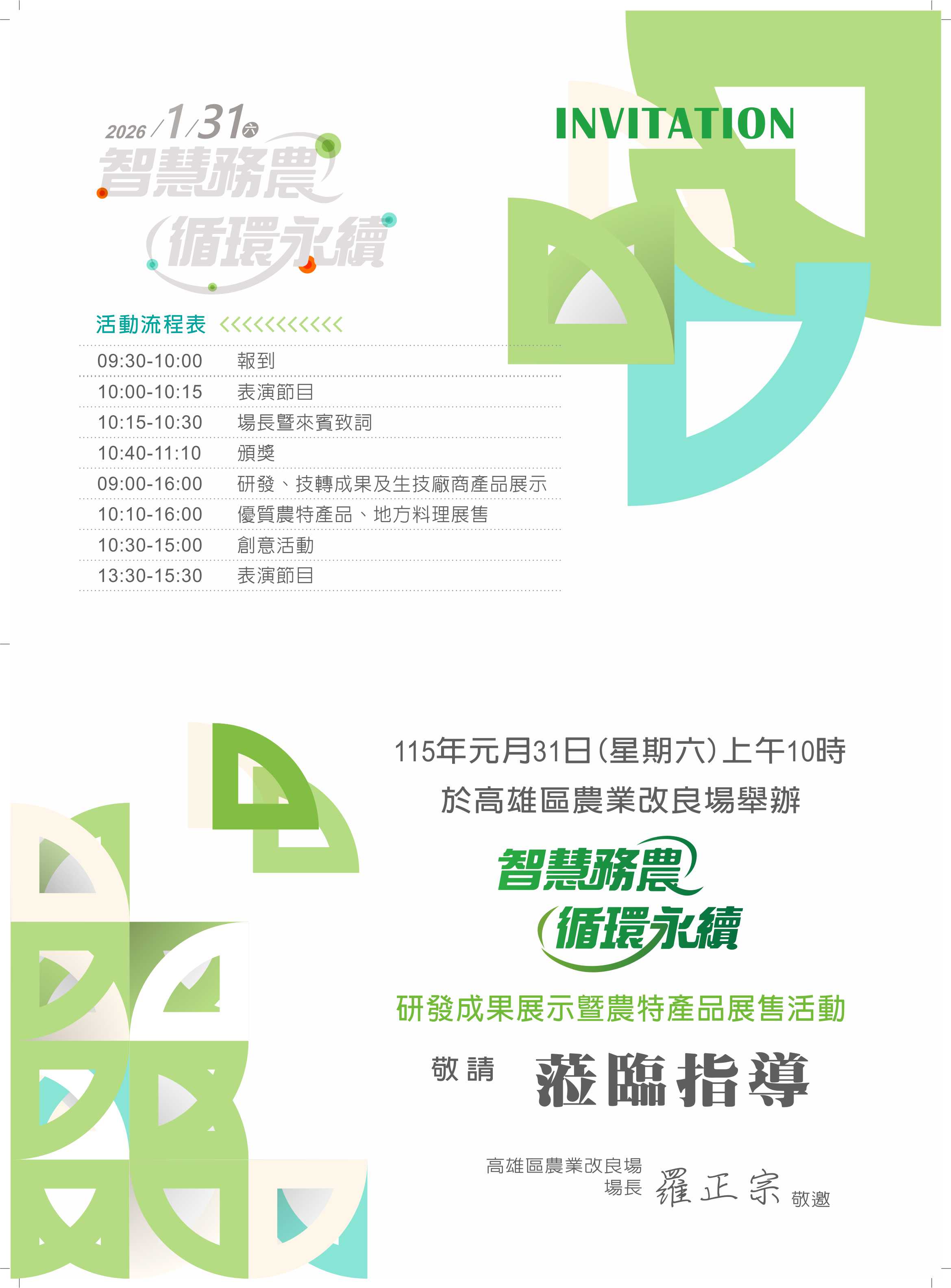 主旨:本場訂於115年1月31日(星期六)上午9時至下午4時在行政研究大樓前廣場舉辦「智慧務農 循環永續」迎賓日活動,歡迎蒞臨指導,請鑒核/查照。