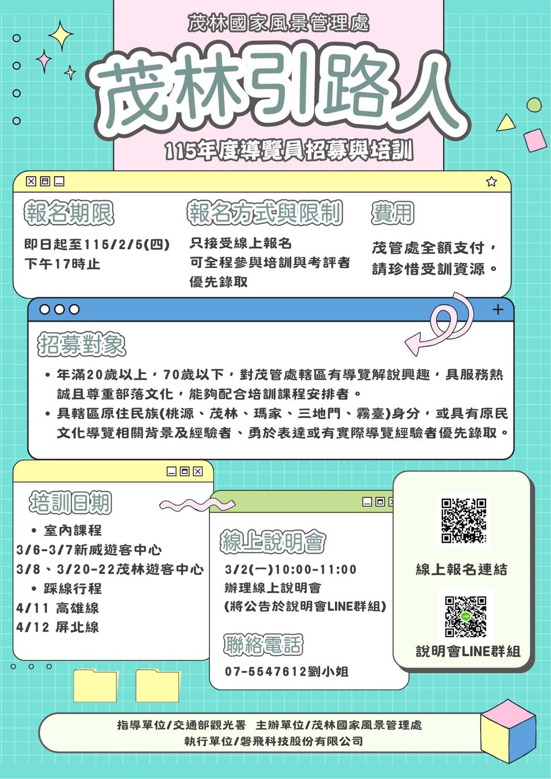 一、 為提升本轄區及接待服務品質,自即日起辦理115年度導覽解說志工招募,報名期限至115年2月5日止,僅接受線上報名。