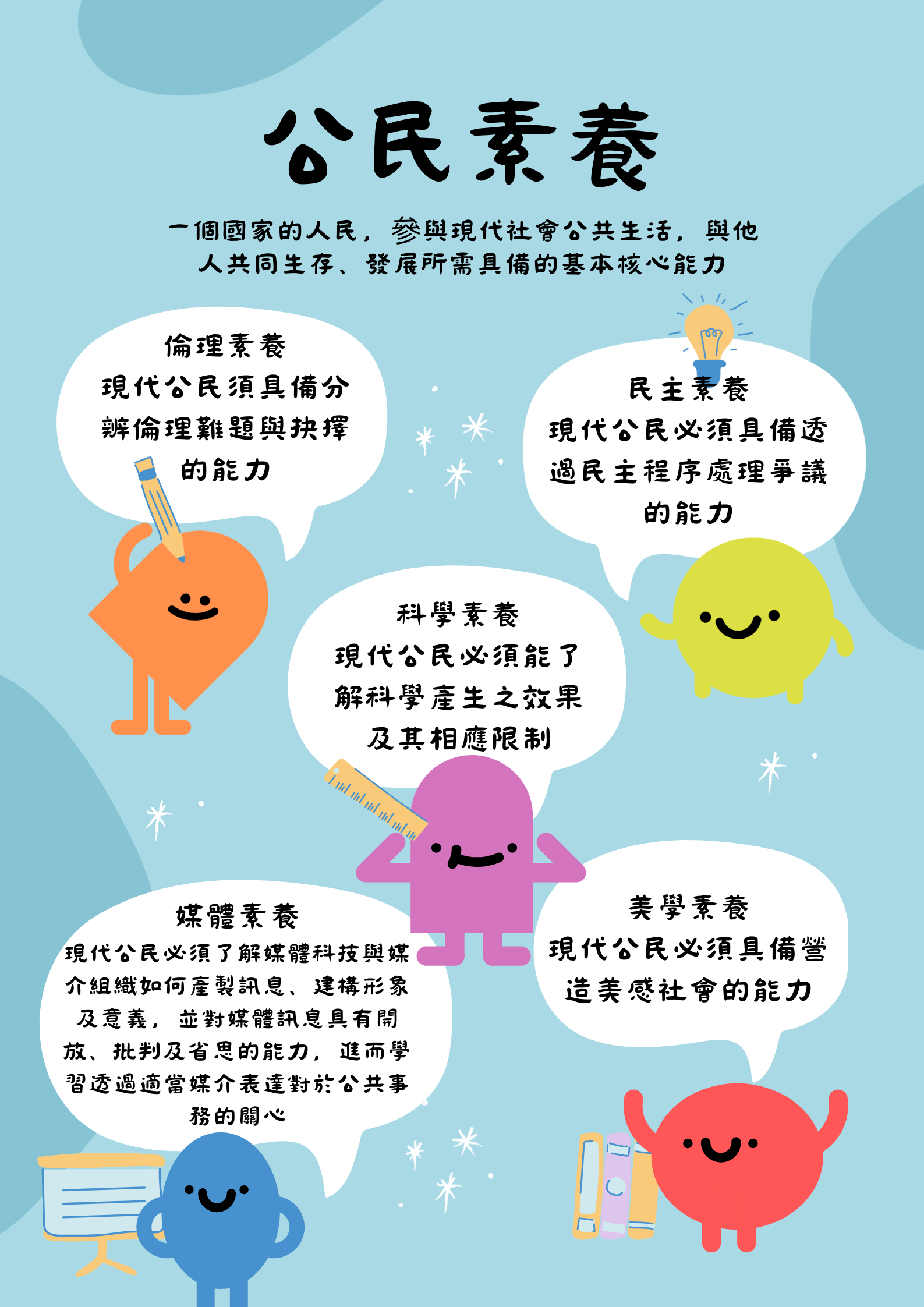 所謂公民素養是指「一個國家的人民,參與現代社會公共生活,與他人共同生存、發展所需具備的基本核心能力。」